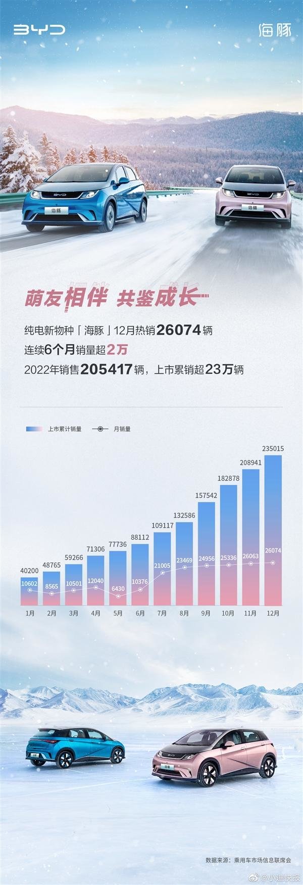 数据显示,比亚迪海豚11月共卖出了26074台,同比再增长,这也是它连续6个月实现月销量破2万的成绩,2022年全年销量205417台,上市以来累计销量更是超过了23万台,妥妥成为了爆款。