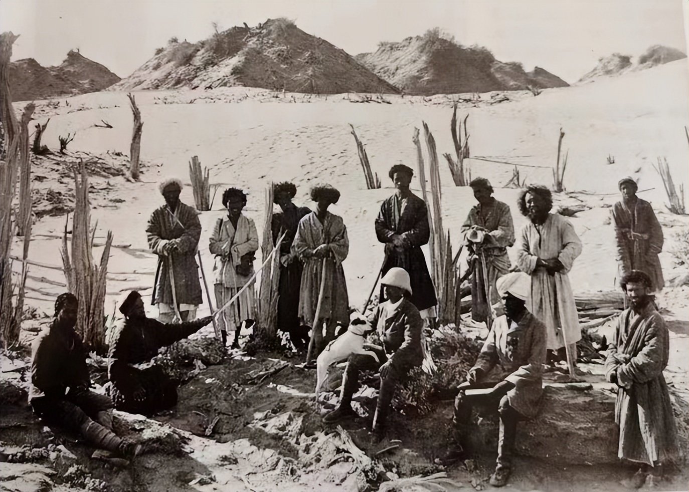 图为1906年,斯坦因和他的助手在尼雅遗址考察,尼雅是汉代古国所在地,在照片中,斯坦因的膝盖上趴着他的爱犬。斯坦因是奥地利人,是臭名昭著的文物大盗,是第一个进入敦煌莫高窟藏经洞的洋人,他用四锭马蹄银就换取了藏经洞里的无数珍稀文物。回国之后声名鹊起。