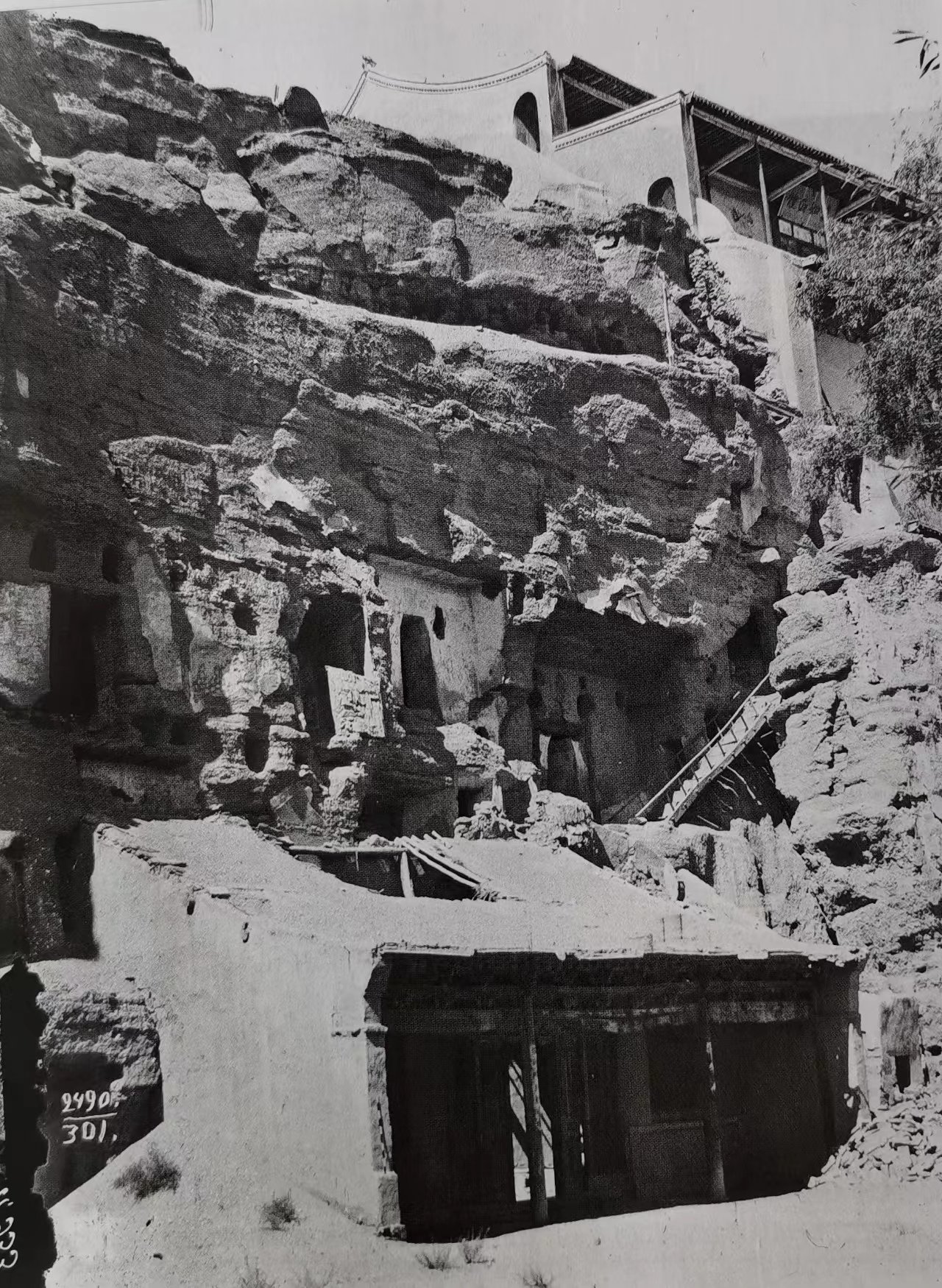 图为鄂登堡探险团队拍摄的敦煌莫高窟外景,此时莫高窟第96窟外的建筑还是五层楼阁。