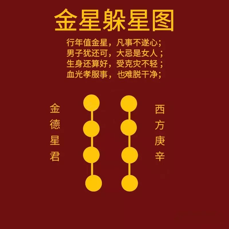 金德星:正月十五酉时(下午5:00—7:00),面朝东南方躲星。金星亦称云朝阳星,是值年五大凶星之一,男女皆凶:行年值金星,灾祸易生成;男逢忧虑大,女逢苦伶仃。
