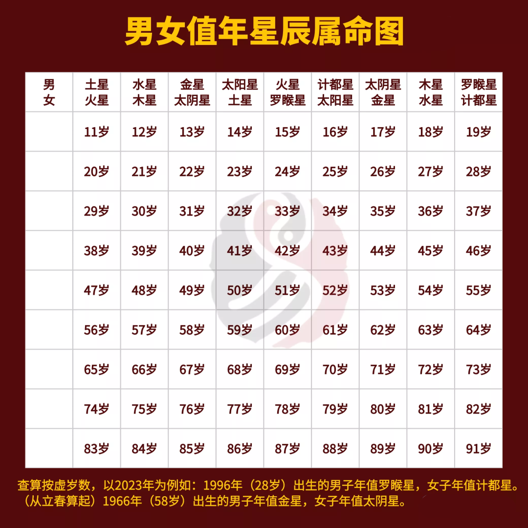 1、查算按虚岁数(从立春算起),以2023年为例如:1996年(28岁)出生的男子年值罗睺星,女子年值计都星。1966年(58岁)出生的男子年值金星,女子年值太阴星。