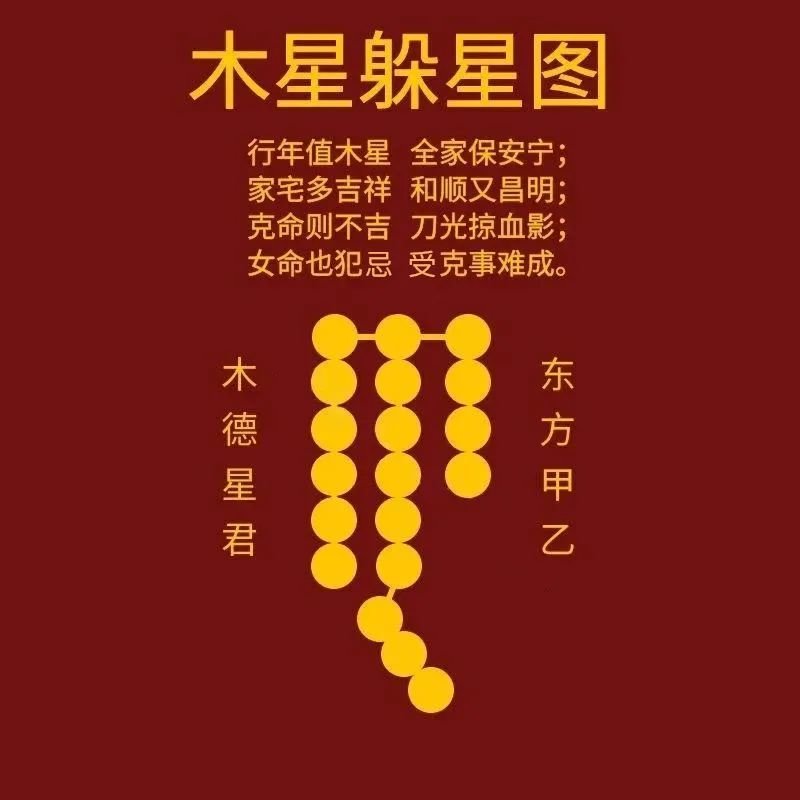 木德星:正月二十五卯时(上午5:00—7:00) ,木星半凶半吉,宜面朝西南方躲星。木星俗称太岁,犯太岁大凶,所以说“木星坐命凶则灾吝频生”。