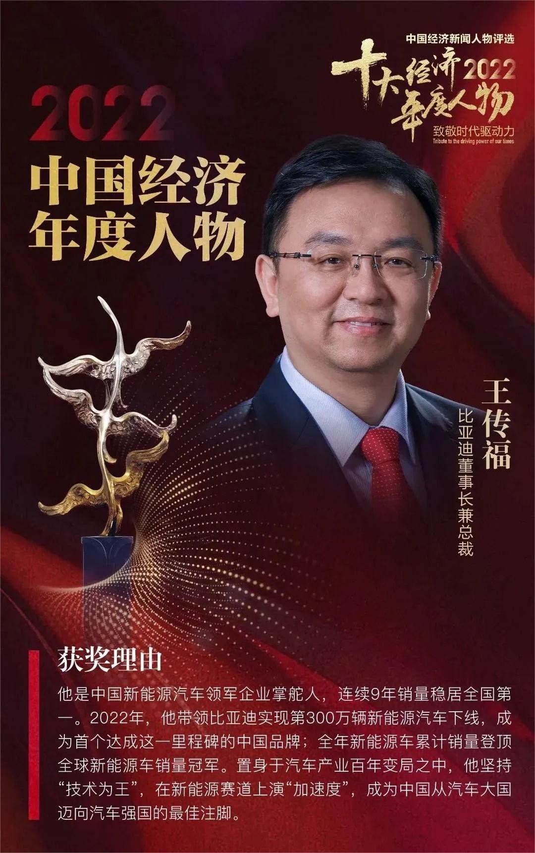 1月6日,由中国经济传媒协会主办,新浪财经、第一财经联合承办的2022中国十大经济年度人物颁奖盛典在北京举办,比亚迪董事长兼总裁王传福当选“2022中国经济年度人物”。作为中国经济领域的“奥斯卡”,“十大经济年度人物”从“创新性、颠覆性、前瞻性、成长性、持续性”五个维度出发,评选出2022年引领商业之美、产业创变、时代之潮的十大经济年度人物。