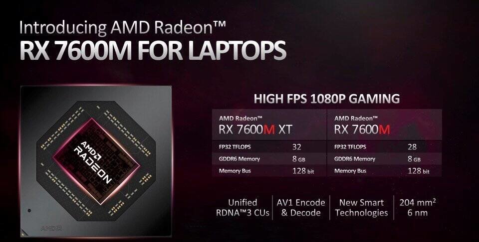 RX 7600M:50~90W 性能释放,RDNA3 架构,28CU,8GB 16Gbps GDDR6 显存