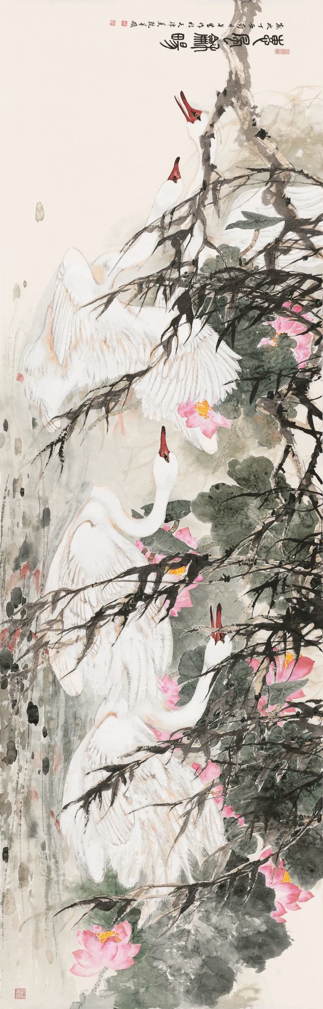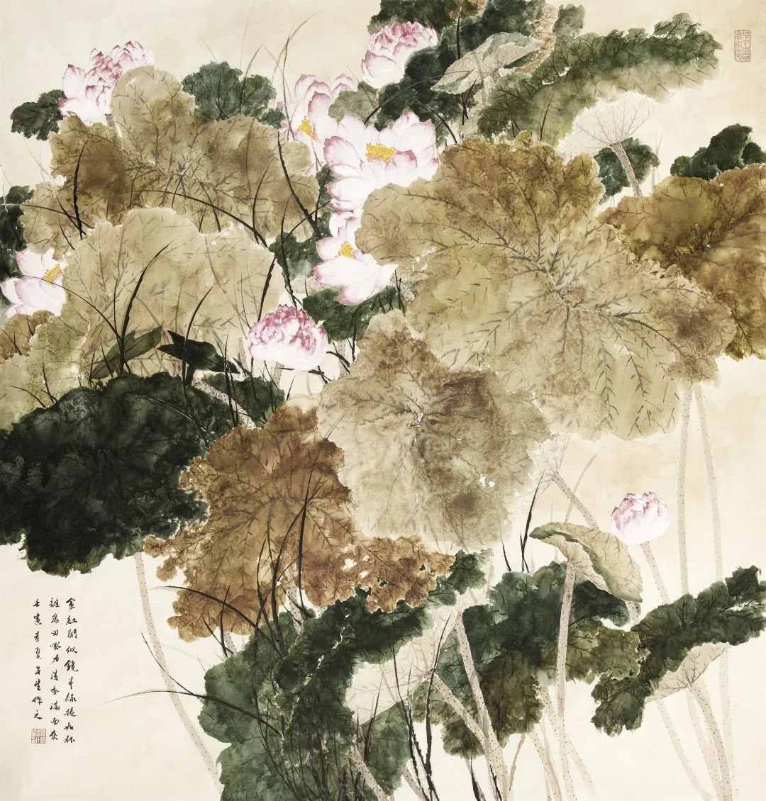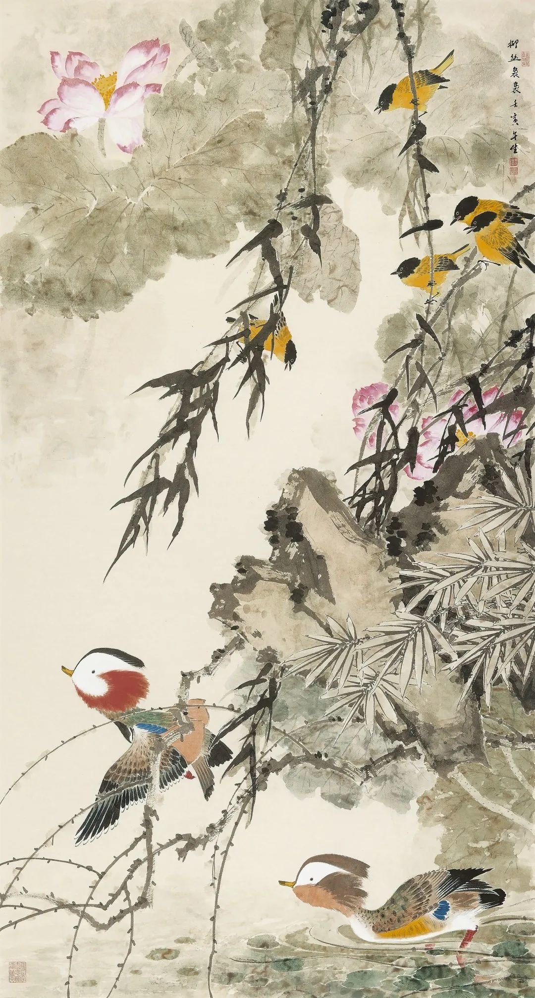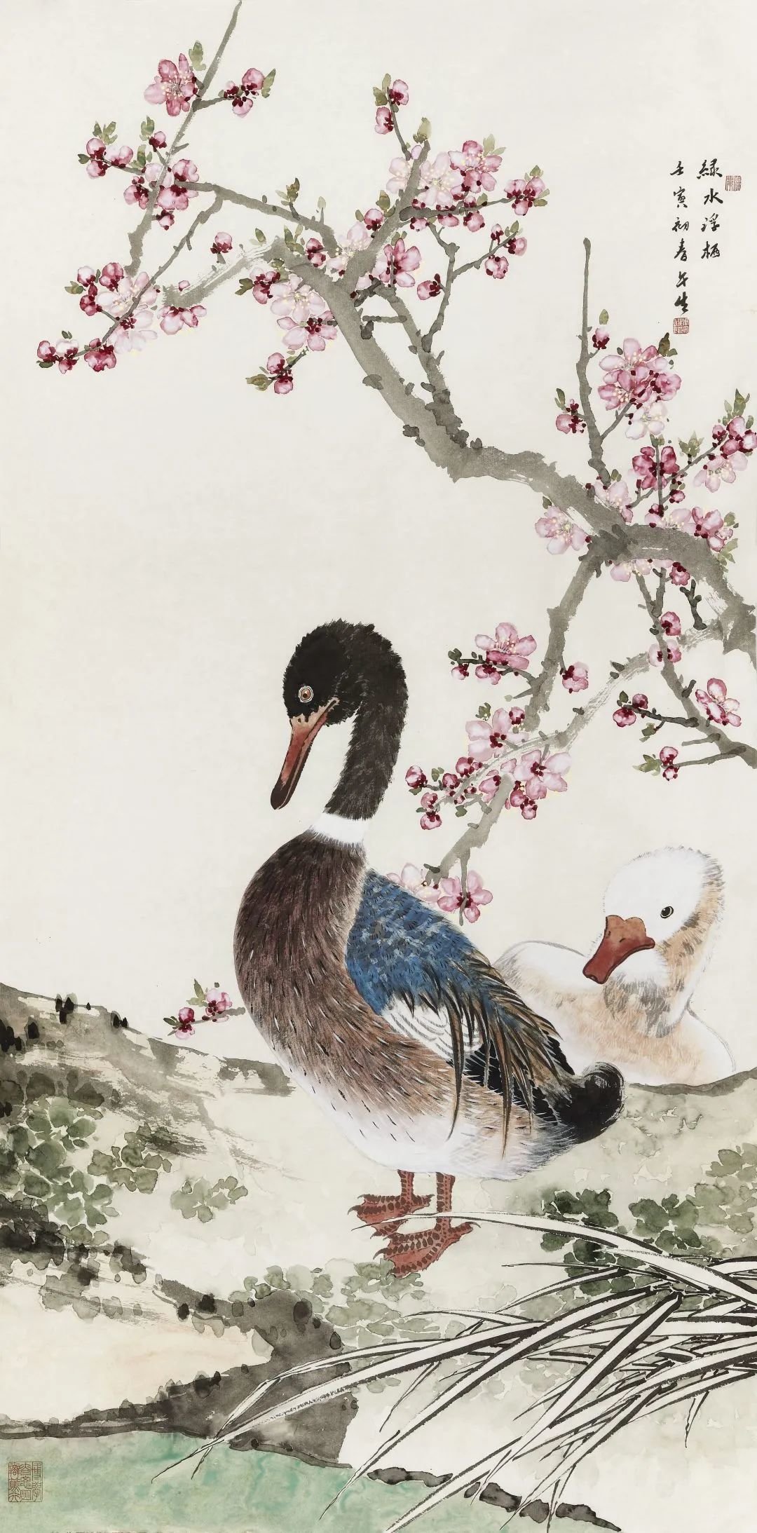 他将对于物象性灵与机趣的认知,通过直接以色状物、以墨状物的方式抒泻于纸上,藉色、墨之间的互融,互动、互渗,乃至撞色破墨等手法,逼近、摄取造物的气息。如在其《春江水暖》(2010)、《花飞》(2006)、《春融只待乾坤醉》(2008)等作品中,以薄透的墨色质感与细腻婉约的手法再现自然春光下的清和明丽,注重画面细节与整体的微妙关系,以花鸟世界的一角折射出自然造物的盎然生机;而在《岁朝昌和》(2006)、《娇秋日》(2009)、《日丽花绮》(2011)中,作者致力于聚焦表现花卉在繁盛开放时的状态,既对于中国传统花卉图像的“景”、“境”的关系进行了深入的思考,同时又显现出画家对于色彩的独具针对性的研究意识,无论是浓丽雍容还是淡雅清澈,都贮存并传递了作者对于自然的赤诚感觉。