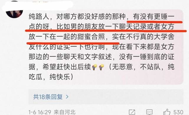 网友们合理质疑内容的真实性,认为目前还没有“一锤到底”的证据,建议女方放出两人的甜蜜合照,或者其他更直接的证据。