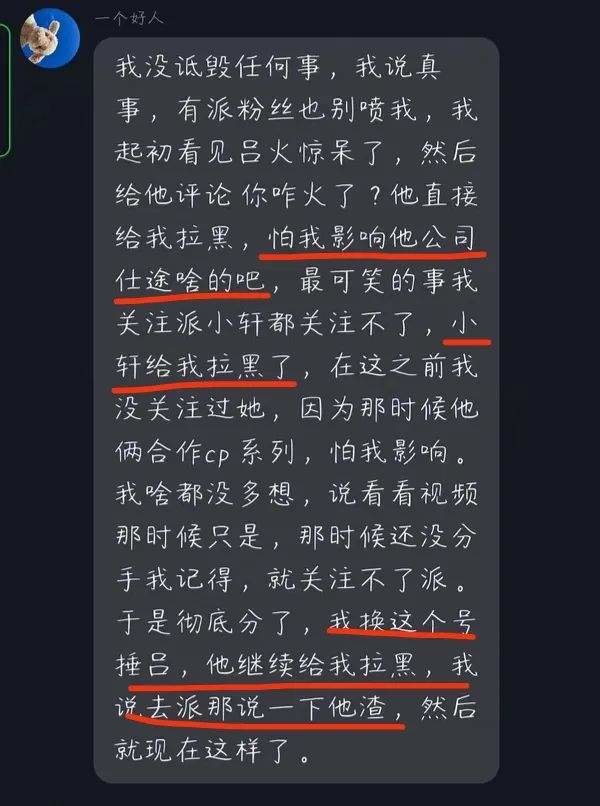 不仅如此,据该女网友爆料,与吕长隆合作的伙伴“派小轩”,也把这位网友拉黑了。