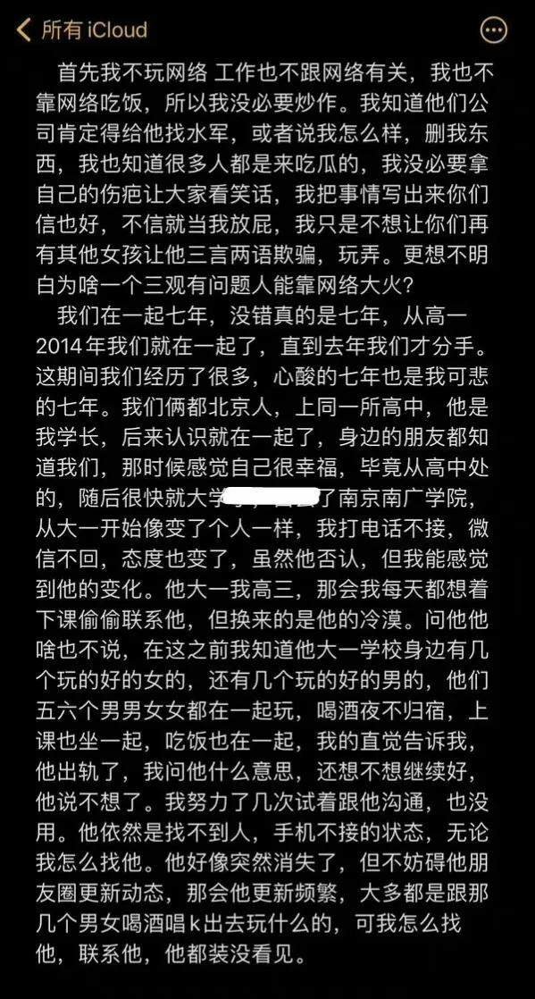 “疑似塌房”这件事,还要从前几天说起,一位自称“吕长隆前女友”的网友,在社交平台上发长文,事无巨细地写出了与吕长隆恋爱7年,对方屡次出轨的经历。