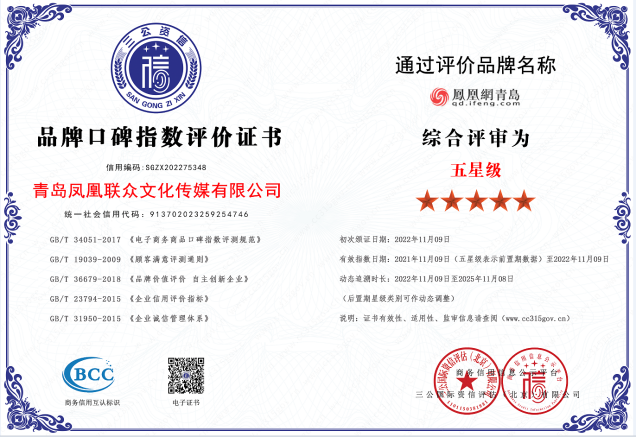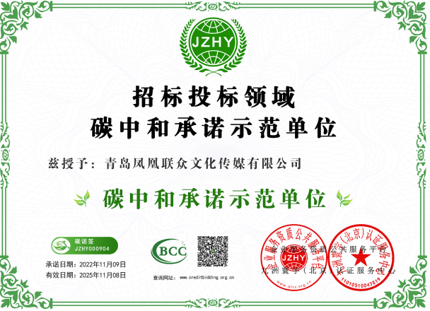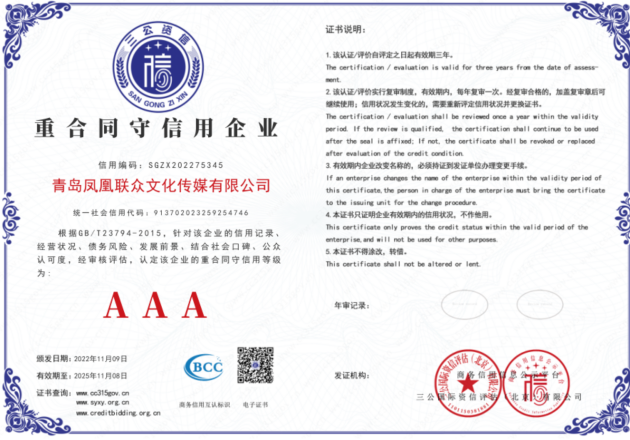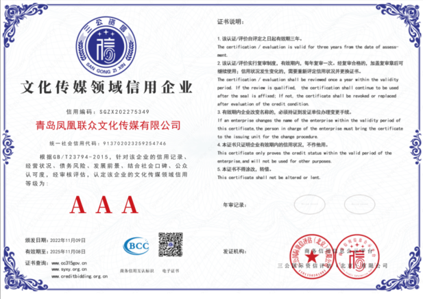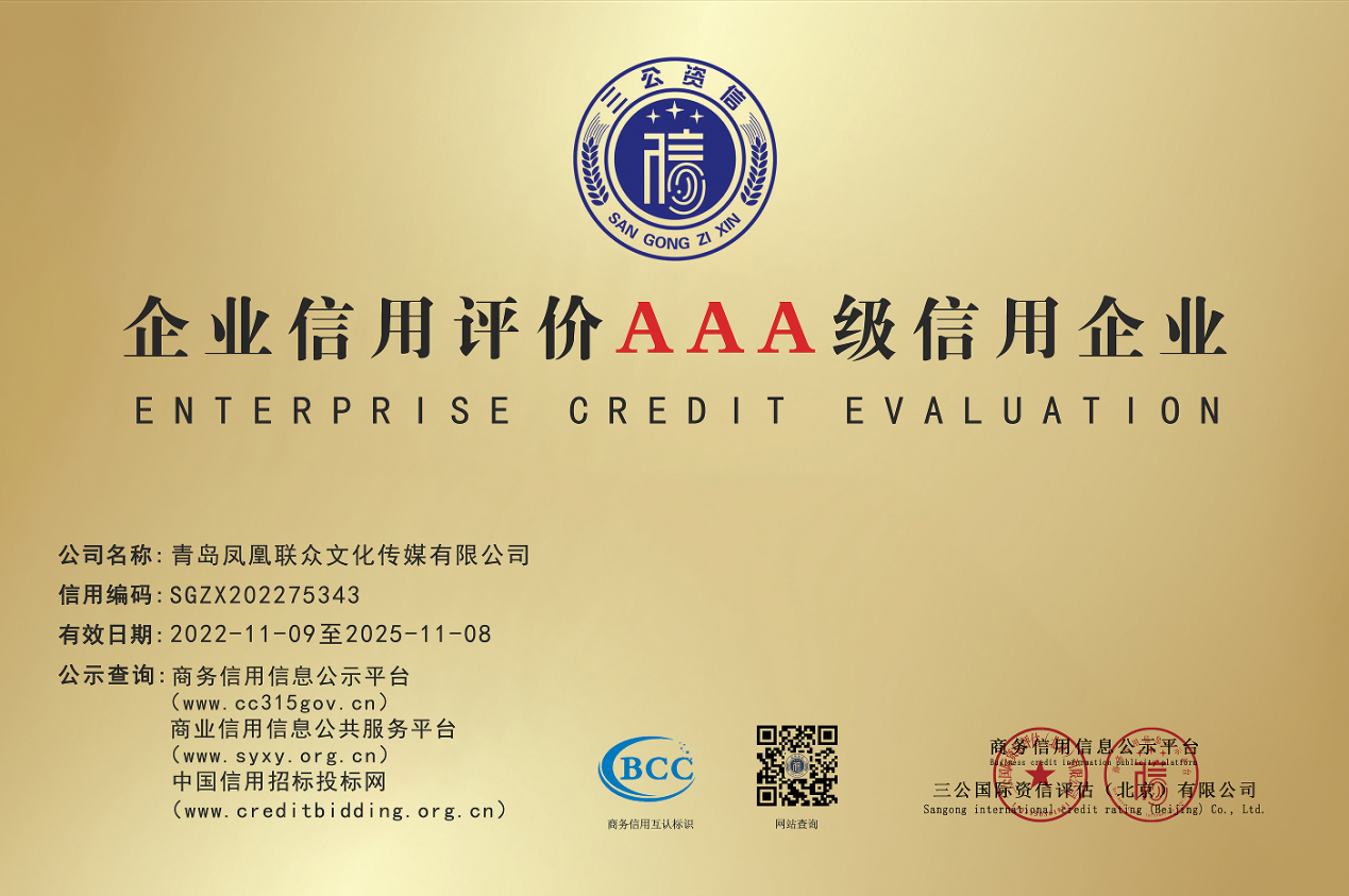 凭借诚信经营的原则以及蓬勃的行业发展前景和良好的社会口碑与公众认可度,青岛凤凰联众文化传媒有限公司顺利通过三公国际资信评估(北京)有限公司针对企业4个方面、11个板块、132项指标综合评估,荣获:“AAA级企业信用等级” “文化传媒领域AAA信用企业” “AAA级重合同守信用企业” “AAA级诚信经营示范企业” “AAA级质量服务信誉企业” “五星级品牌口碑指数评价”“招标投标领域碳中和承诺示范单位”。