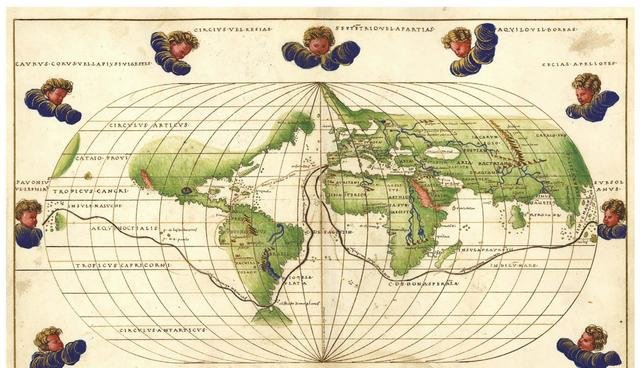 1544年一位热那亚制图师绘制的世界地图,图中标注的线路是麦哲伦环球航行的线路。