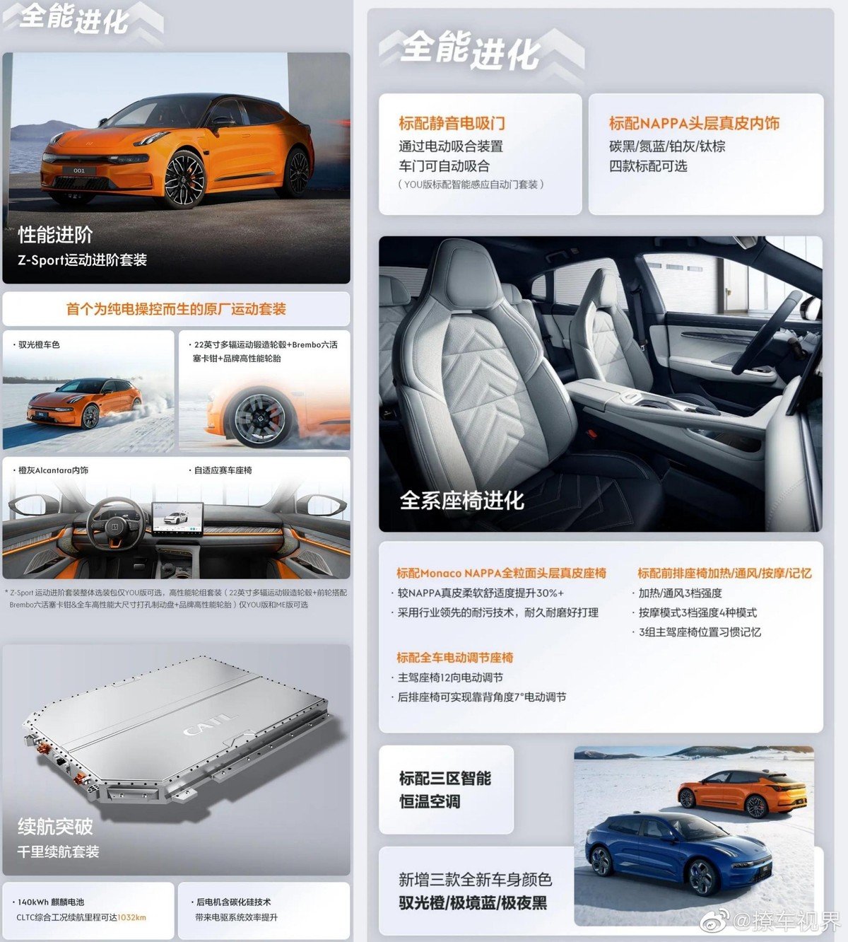 内饰方面,2023款极氪001的用料就要高级不少,全系车型采用比NAPPA头层真皮更高级,能让乘坐柔软舒适度提升30%+的Monaco NAPPA全粒面头层真皮,这也是认真听取了极氪001车主们的建议所得出的正向反馈,在保留运动座椅包裹性的同时,Monaco NAPPA材质会让乘坐舒适度进一步提高,新增的腰部调节功能,能大大加强极氪001长途乘坐的舒适性。不仅如此,极氪001全系标配前排座椅加热/通风/按摩/记忆;全车电动调节座椅、智能恒温空调套装等豪华配置,也得以实现全系标配。