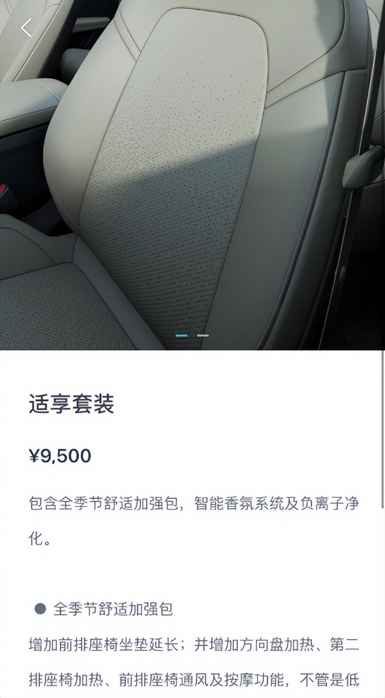 蔚来ET5拥有多种内饰颜色以及包覆材料的搭配,然而这都需要不菲的选装费用,最高级的内饰选装包居然高达27300元!若不选装,那么蔚来ET5的内饰就显得非常廉价。不仅如此,蔚来ET5还有一个需花费9500元得到的“适享套装”,内含座椅腿托、座椅通风、按摩能功能,然而,2023款极氪001早已经全系标配了。
