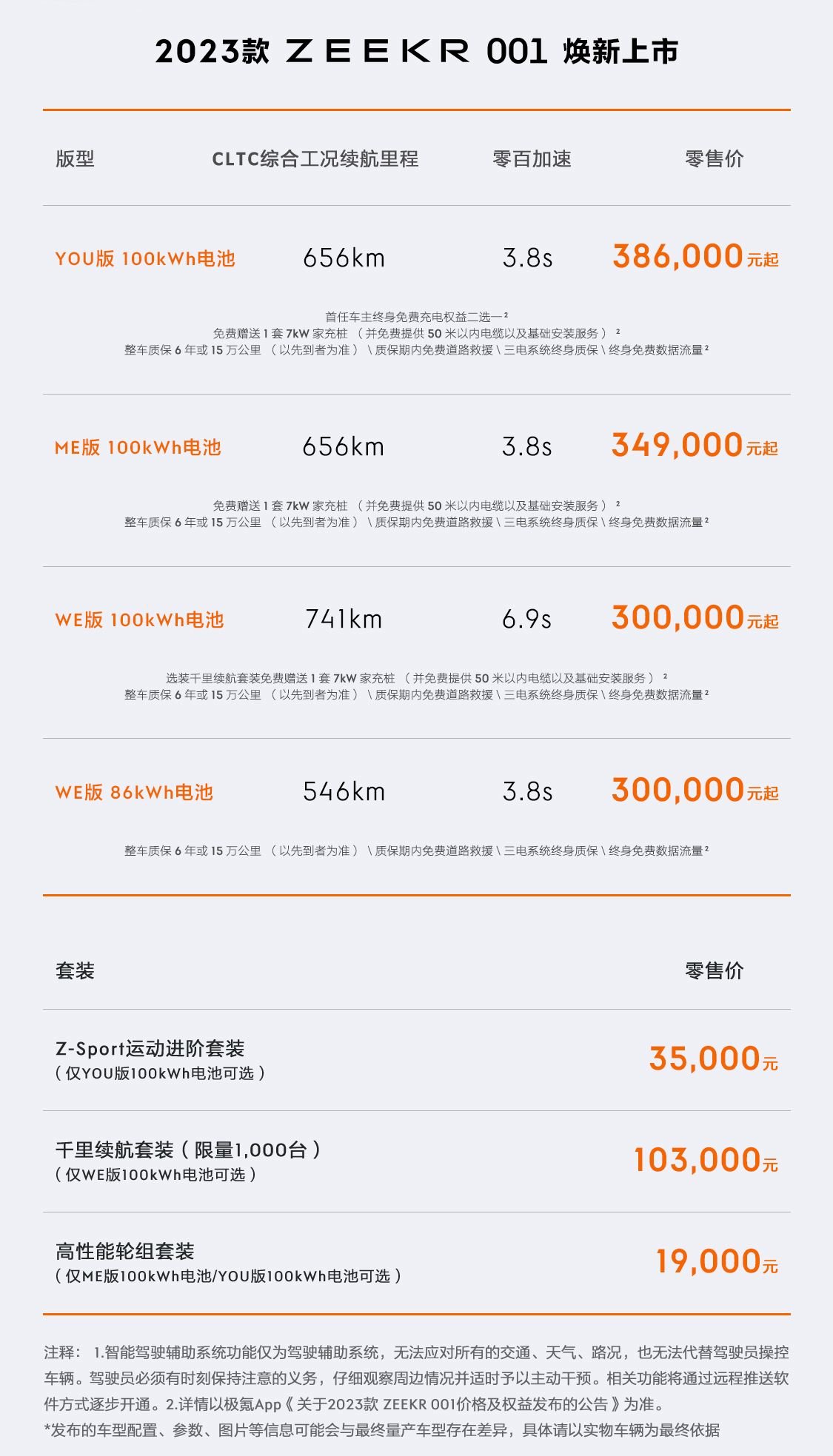 2023款极氪001全系共推出四款车型,售价30万元起至38.6万元起,YOU版车型还提供Z-Sport运动进阶套装,WE 100版车型提供千里续航套装,限量1000台,此外,还有高性能轮组套装等个性化配置供用户选择;蔚来ET5推出了分别搭载75kWh和100kWh电池的两款车型,售价依次为32.80万元和38.60万元。