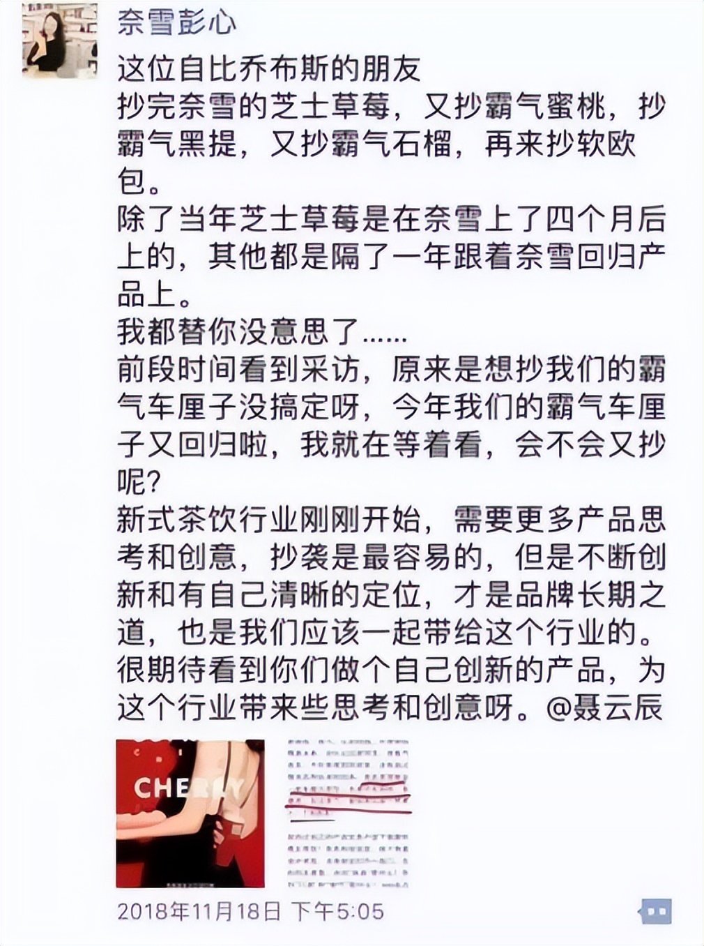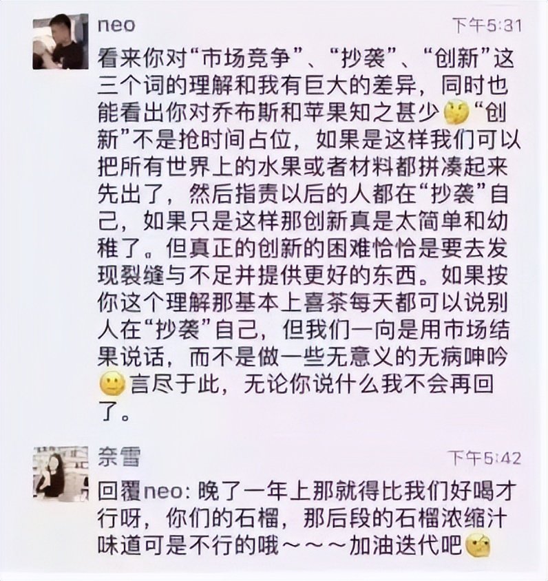 其实,奶茶也不是什么高科技行业,谈到产品方面的创新和模仿,很难说谁抄袭谁。但是,聂云宸的回复,自负,直接,有锋芒,有攻击性。而这种风格,也使他屡陷争议。