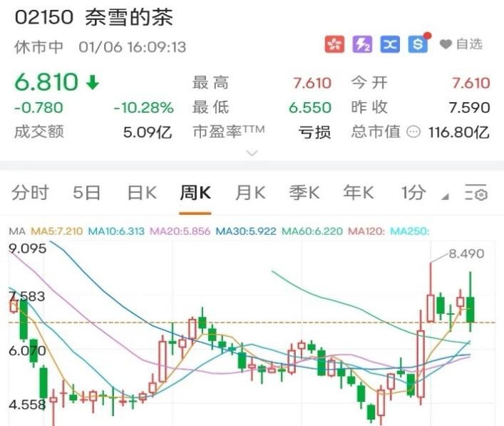 奈雪的茶发行价19.8港元/股,开盘跌至18.86港元,随后股价一路下跌,直至收盘时股价为17.12港元,跌幅为13.54%。此后,奈雪的茶一路跌跌不休,在2022年3月一度跌至3.65港元/股。截至2023年1月6日,奈雪的茶收盘价为6.81元,总市值116.8亿。