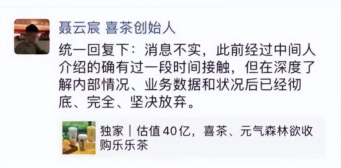 起因是有消息称,喜茶和元气森林欲收购新式茶饮品牌乐乐茶,双方都非常看重乐乐茶的渠道价值,并给出了40亿元估值。聂云宸立即转发这则消息予以澄清,说:“此前经过中间人介绍的确有过一段时间接触,但在深度了解内部情况、业务数据和状况后已经彻底、完全、坚决放弃。”
