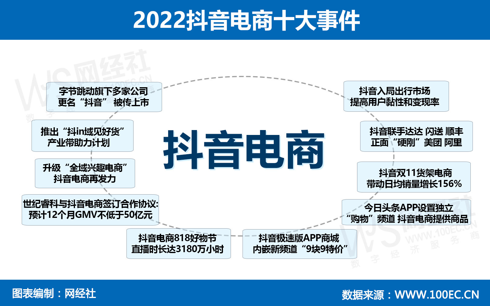 2022年,作为直播电商巨头之一的抖音动作频频,升级“全域兴趣电商”,接入京东快递,联手达达、闪送、顺丰,发力货架电商,甚至被传上市。对此,网经社直播电商台(LIVE.100EC.CN)对2022年抖音电商十件大事进行回顾。(详见网经社专题:升级 上市?入局本地生活 2022抖音电商十大事件http://www.100ec.cn/zt//2022dydsbd/)