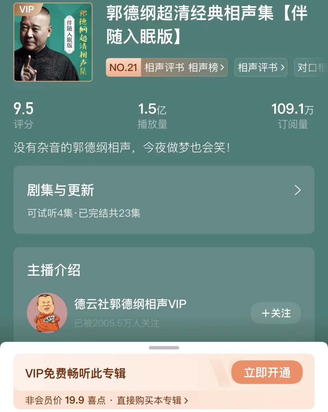 在喜马拉雅平台上,德云社授权官方推出了《郭德纲超清经典相声集》(伴随入眠版),一共二十集,售价19.9元。广告词中写道,“独家正版,超高清音质,只要一杯咖啡的价格即可享受酣畅淋漓的听觉盛宴。”