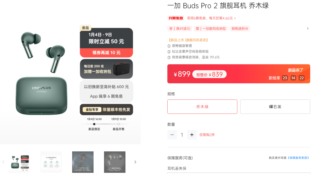此外,一加 Buds Pro 2还拥有高颜值的精致外观设计、最长39个小时的续航和无线充电功能等不俗体验,再加上拉到顶的音质、降噪和空间音频功能,仅售899的一加 Buds Pro 2确实相当超值,不过在1月9日开售前预定的话从官网还能再减50+10元,839元的到手价再度拉升性价比,无疑是近期非常值得入手的旗舰TWS耳机,感兴趣的小伙伴不要错过。