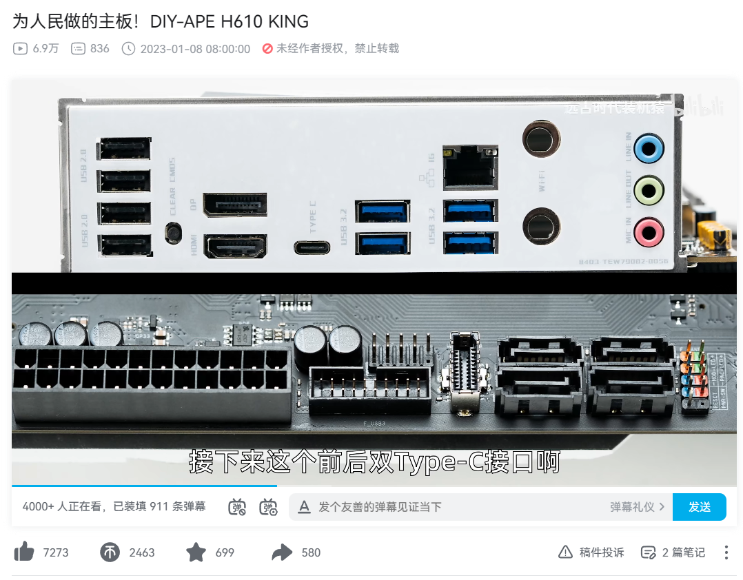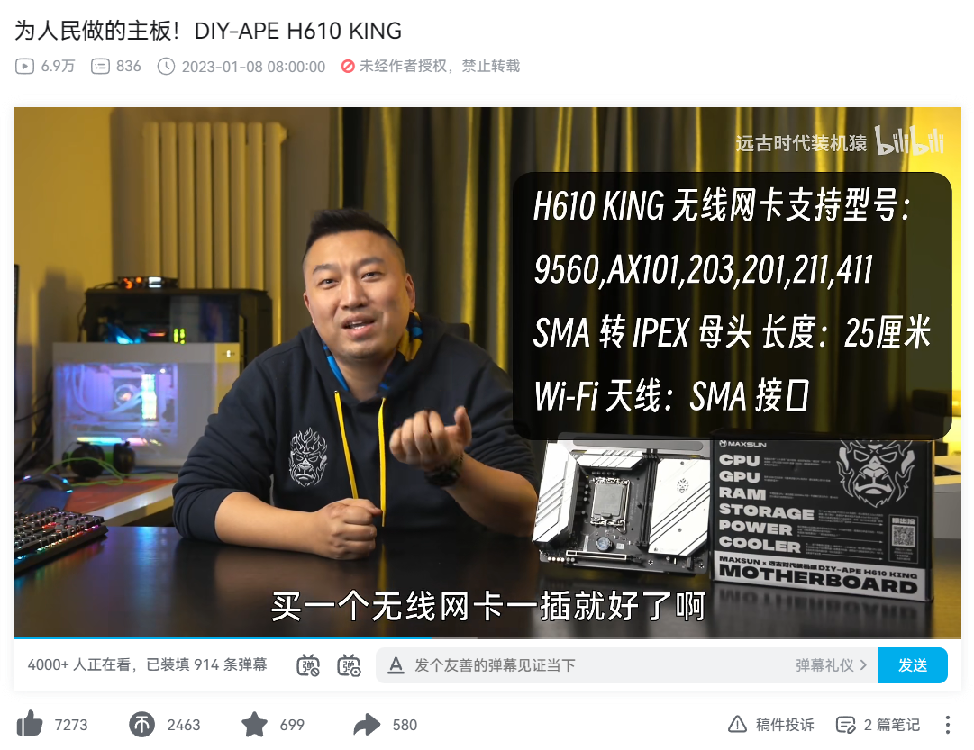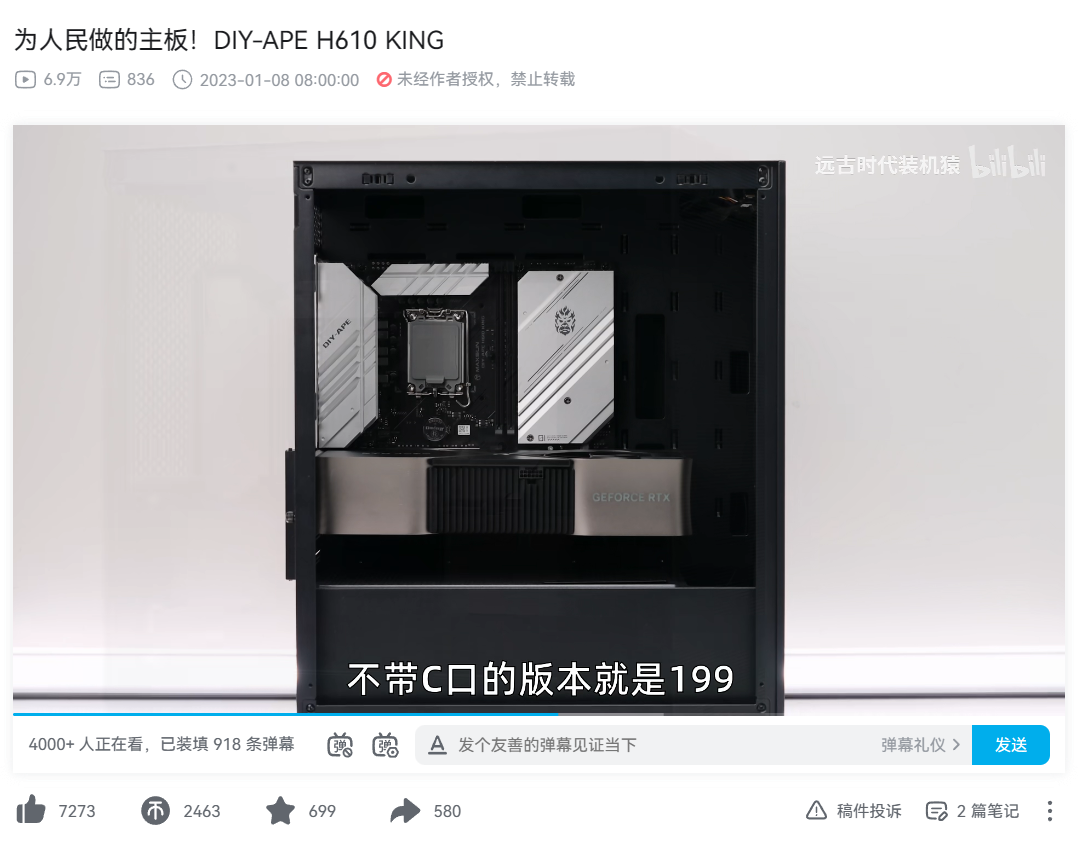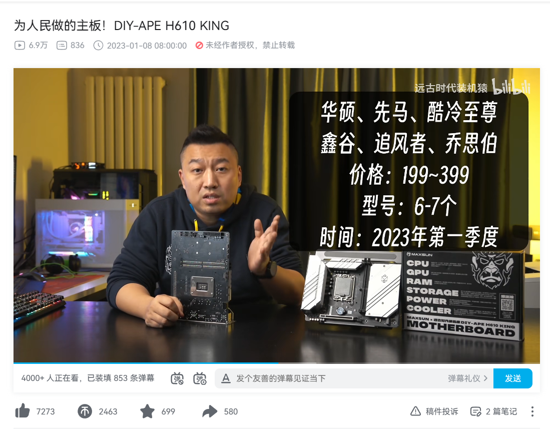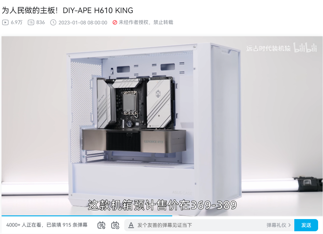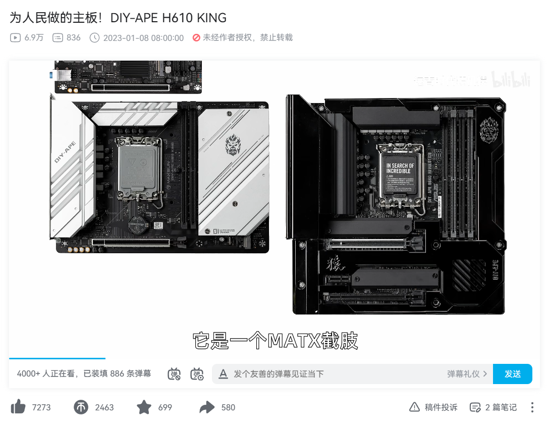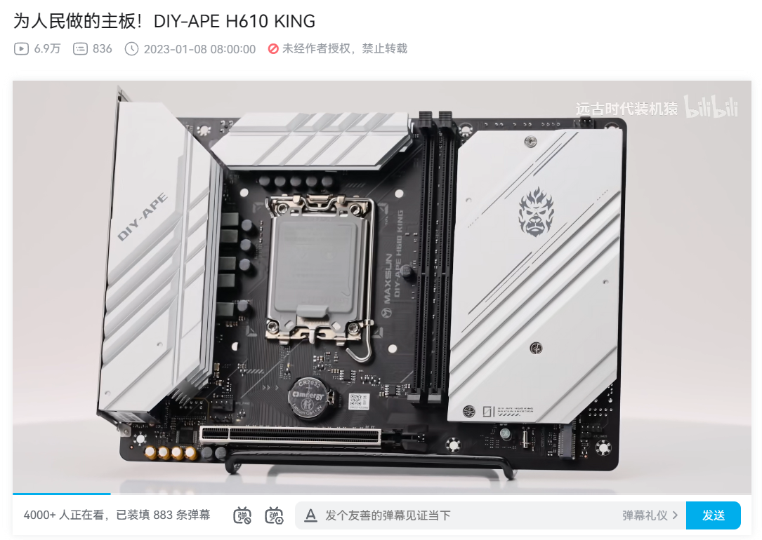 经过了一段时间的延期,这款主板终于发售了,名为 DIY-APE H610 KING,与“丐帮帮主”铭瑄合作开发。