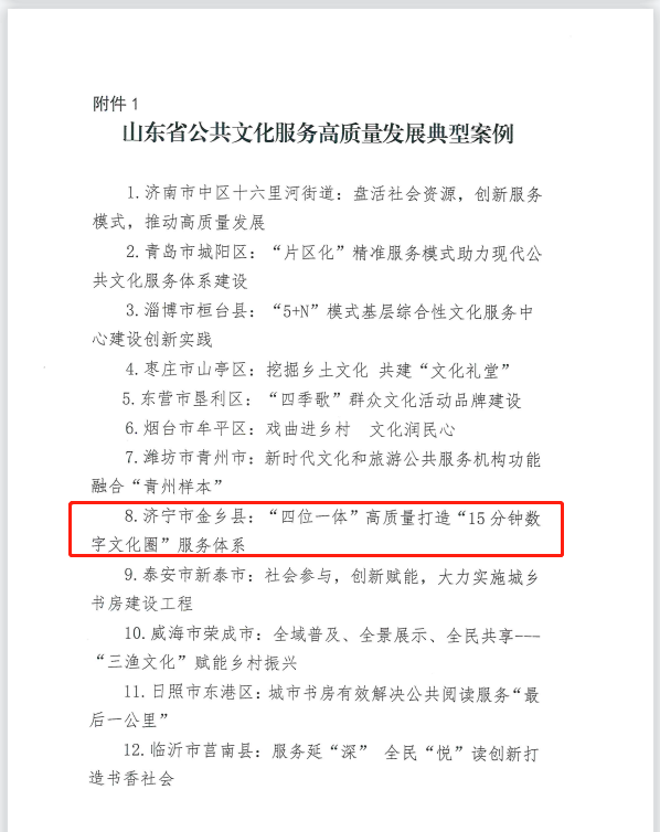近日,山东省下发《关于在全省命名和推广公共文化服务高质量发展典型案例的通知》,金乡县“四位一体”高质量打造“15分钟数字文化圈”服务体系案例获山东省命名推广。