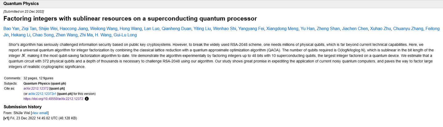 这篇论文标题为《Factoring integers with sublinear resources on a superconducting quantum processor》(在超导量子处理器上用亚线性资源进行因式分解),采用了德国数学家和密码学家克劳斯・施诺(Claus-Peter Schnorr)最新分解算法,结合量子近似优化算法(QAOA),可以使用 非容错(NISQ,或嘈杂的中等规模量子)量子计算机,只需要 372 个物理量子位元(qubits)即可进行破解。