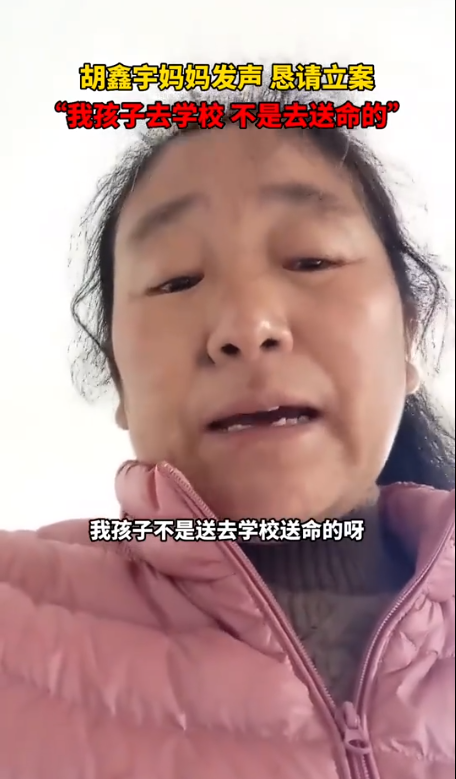 1月5日,胡鑫宇妈妈通过视频发声,恳请立案,“我家鑫宇在学校被害,我恳请公安恳请政府要立案,我孩子不是送去学校送命的呀!”