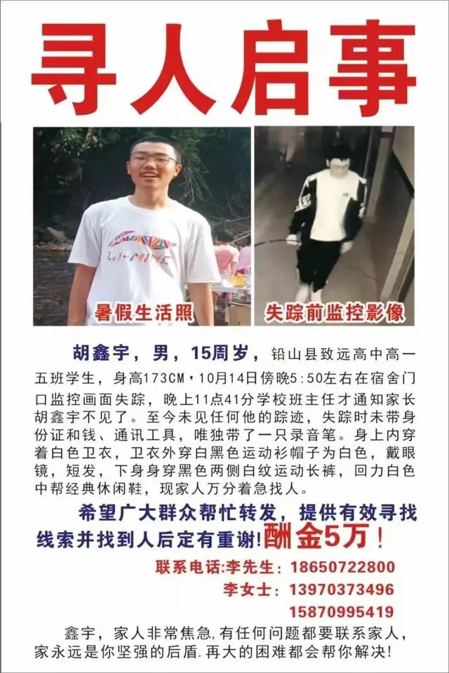 ▲胡鑫宇家属发布寻人启事。