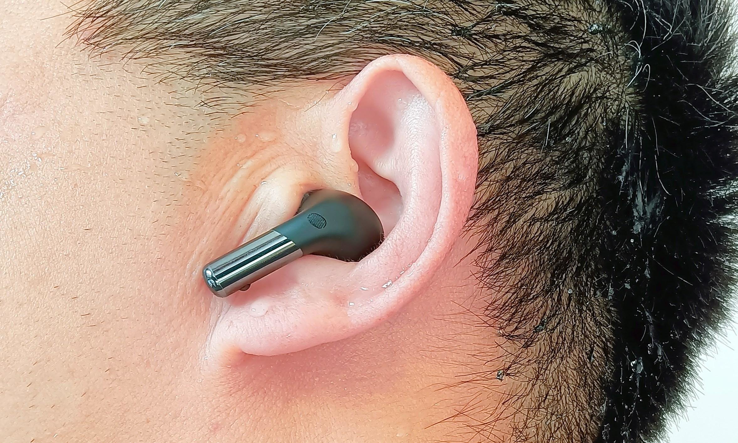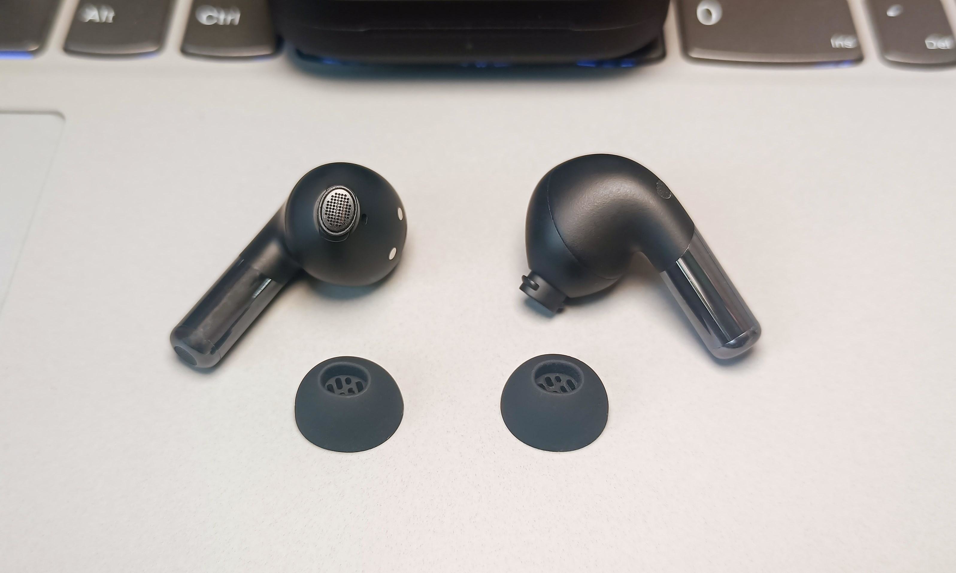 耳塞头的设计符合人体工学,自然向前倾斜,与耳窝完美贴合;耳机内侧的两个充电触点为亮银色,与外壳齐平,不易氧化和腐蚀;机身不同位置设计了三个不同形状的开孔,表面均罩有黑色金属网,以保护其内的FB mic、FF mic和Talk mic,防止耳垢等异物进入。