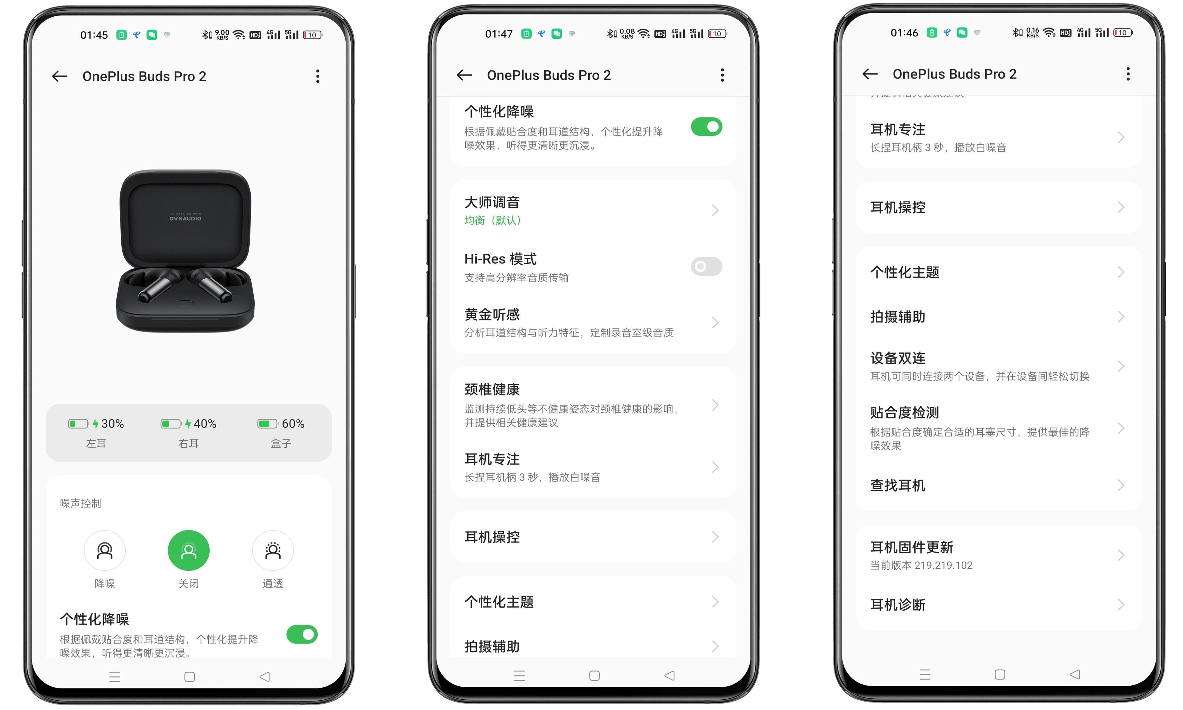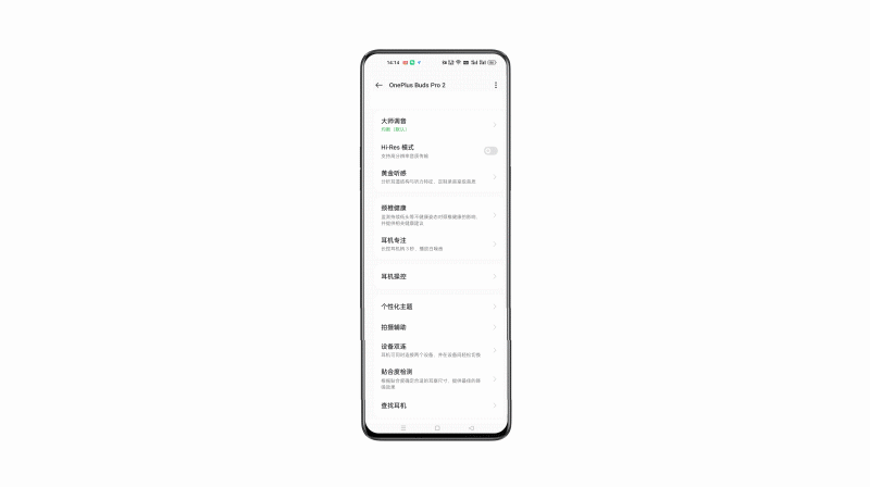 一加手机用户可在蓝牙连接界面直接进入耳机设置界面,这里面提供了个性化降噪、大师调音、个性化弹窗、查找耳机、固件更新等十余项新颖且实用的功能,尤其是黄金听感、耳机专注、耳机操控、贴合度检测等功能,可将耳机打造成符合个人特性的定制化耳机。