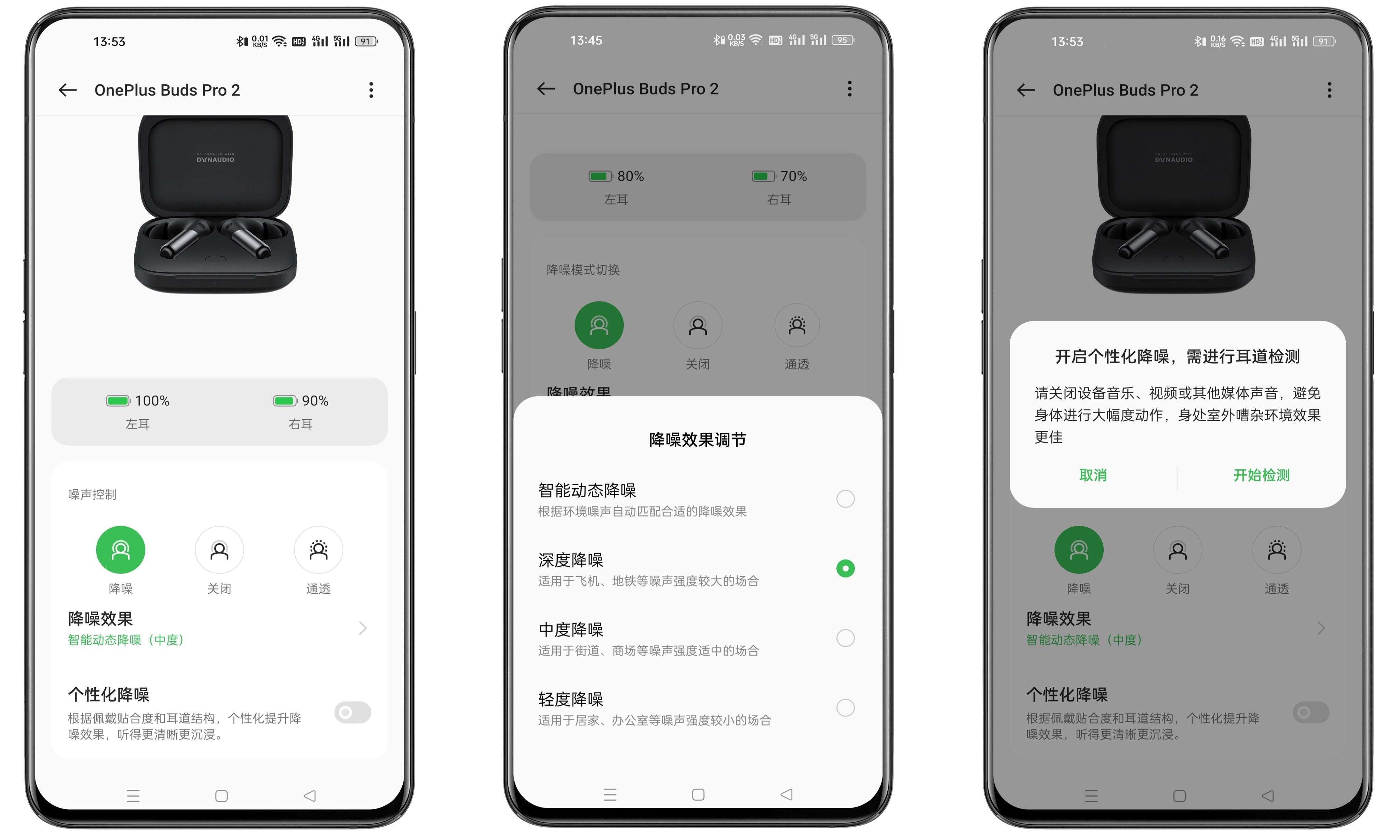 耳机的降噪控制既可手动选择,也可自动化调节。例如,不同室内环境使用时,一般会选择深/中/轻三档;室外环境(通勤路上、运动跑步)时,一般会选择通透模式,耳中听歌也不妨碍与身边人交谈,一举两得。另外,通过贴合度检测,还可以实现更佳的降噪效果,智能检测。