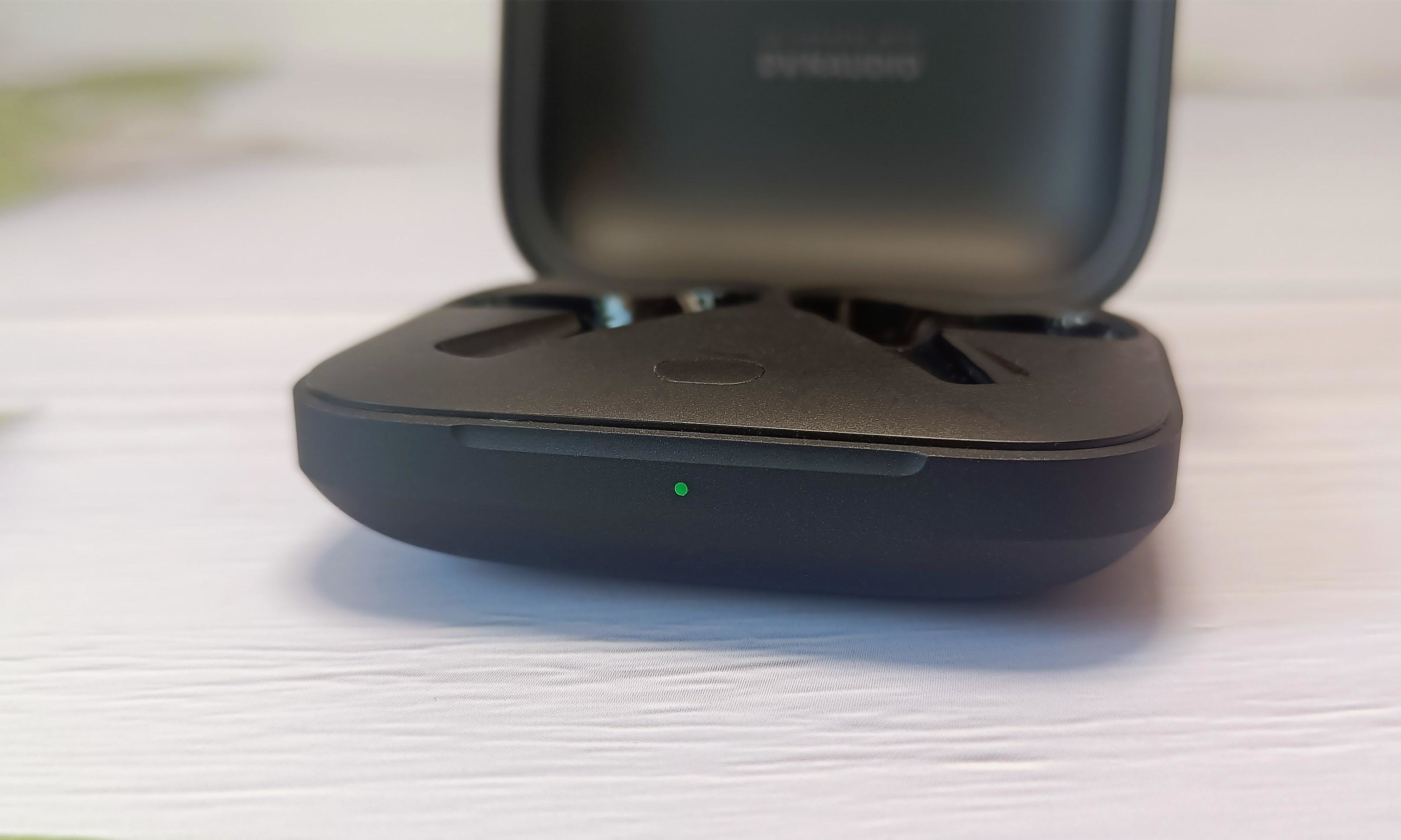 充电盒采用磁吸式设计,打开时需双手配合,顺着中间缝隙向上掀开即可开盖。充电盒内两只耳机平卧其中,上盖内侧印有Dynaudio品牌LOGO;盒身还设计了一个椭圆形物理按键,主要用于恢复出厂设置或蓝牙重连时使用。