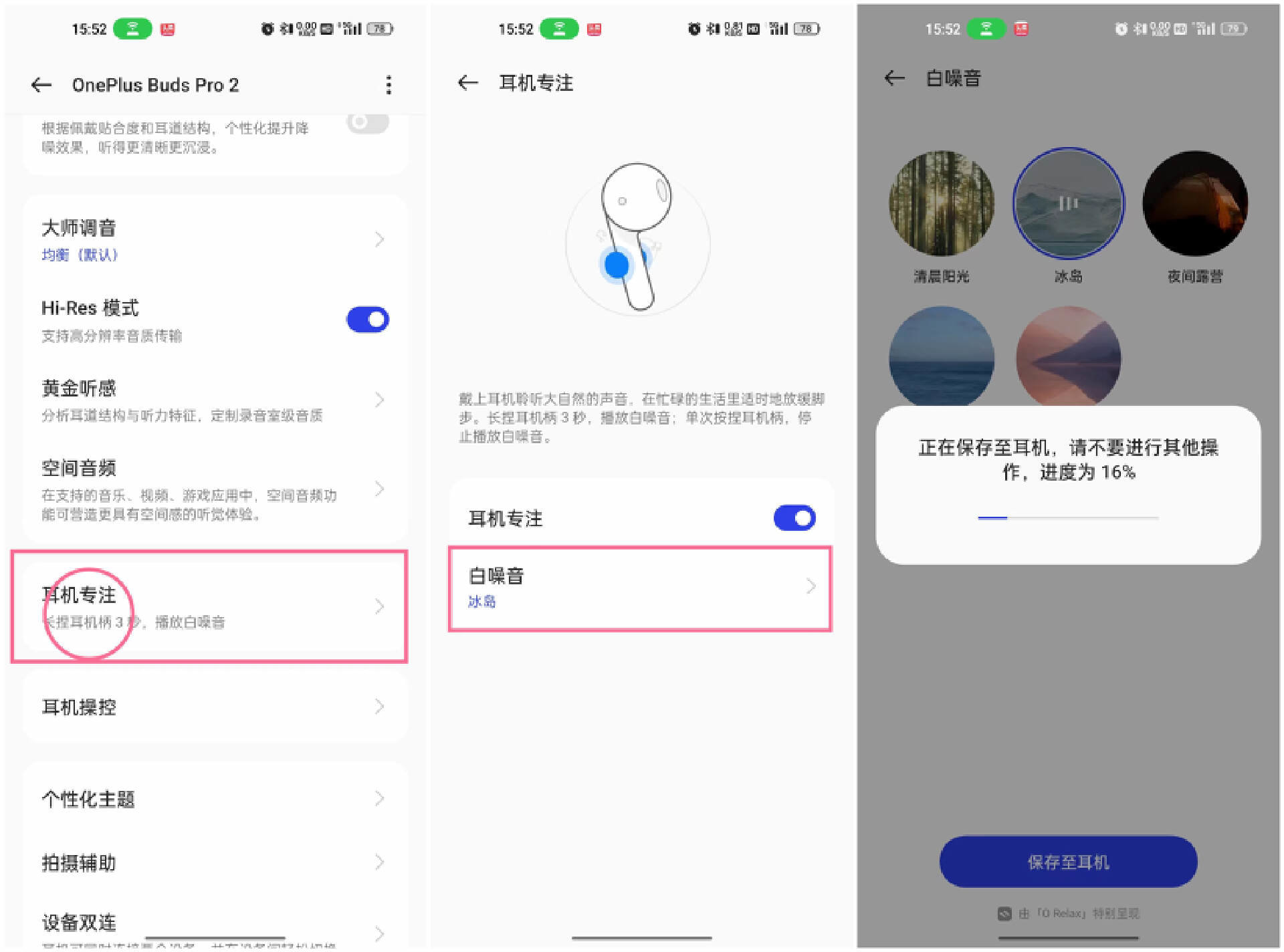 假如工作累了,烦躁了,还可以开启耳机专注功能,清晨白光,鸟语花香;冰岛,潺潺的流水;夜间露营,篝火练练;夏日海边,潮起潮落,冥想,空灵的感觉。