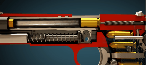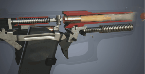 于是乎,在子弹击发之后,套筒会通过闭锁槽带着枪管向后进行后坐,这就是所谓的枪管后坐/管退式原理中的枪管后坐。在此过程中,枪管末端有一个铰链,这个铰链会驱动枪管向下移动,从而使枪管的闭锁从套筒的闭锁槽内滑脱,和套筒之间完成开锁,与此同时,枪管停在原地不动,滑套进一步向后进行后坐,完成抽壳抛壳。