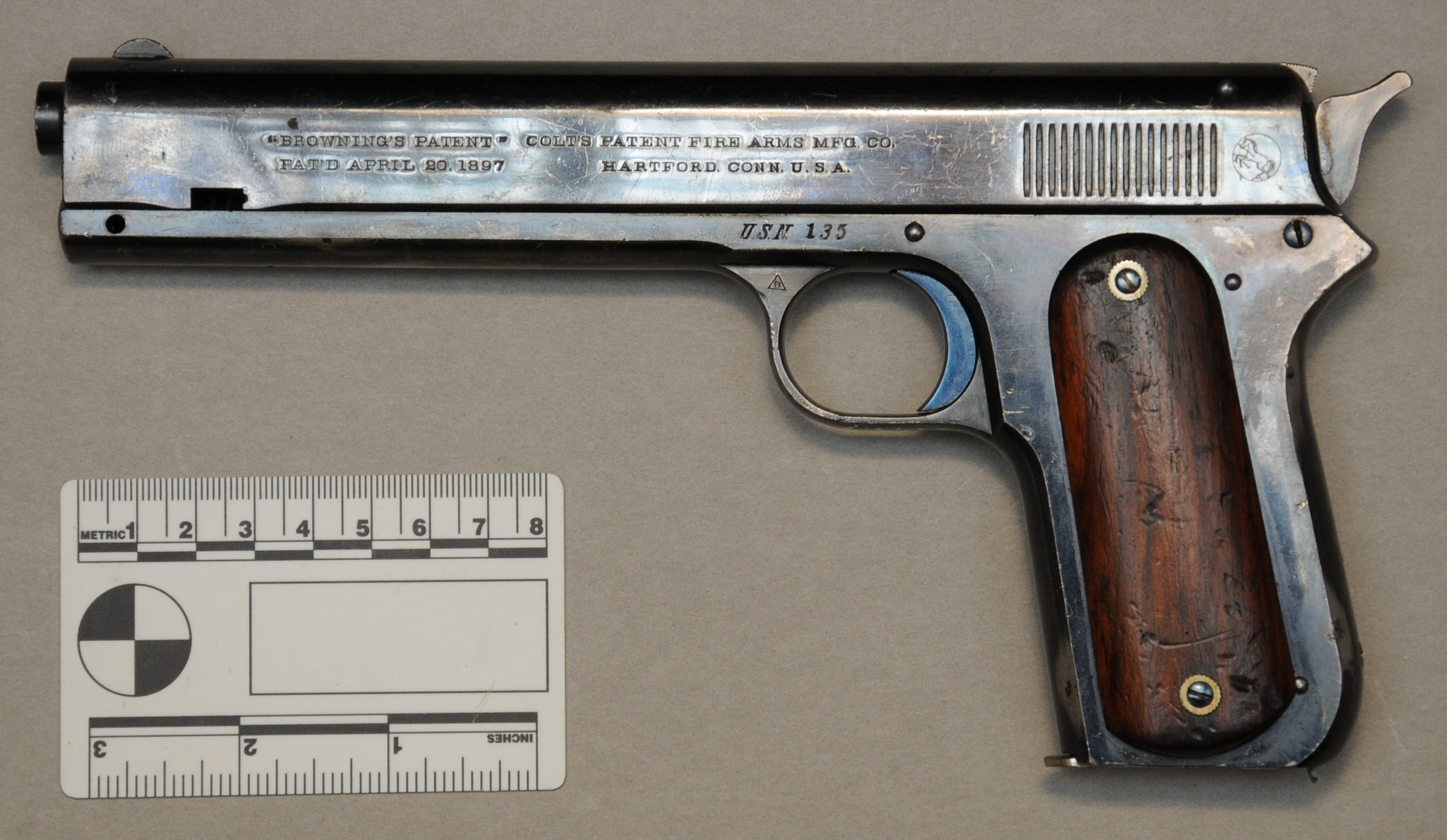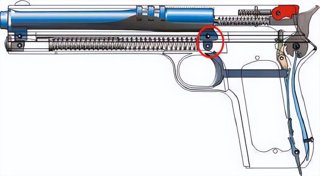 在M1900的时候,由于使用的是.38ACP枪弹,如果使用闭而不锁的自由枪机,则无法承受住膛压,所以一定要采用一个刚性闭锁的结构,抛弃自由枪机原理。于是乎,有了利用枪管后坐、上下起落的方式,完成开锁闭锁的原理。