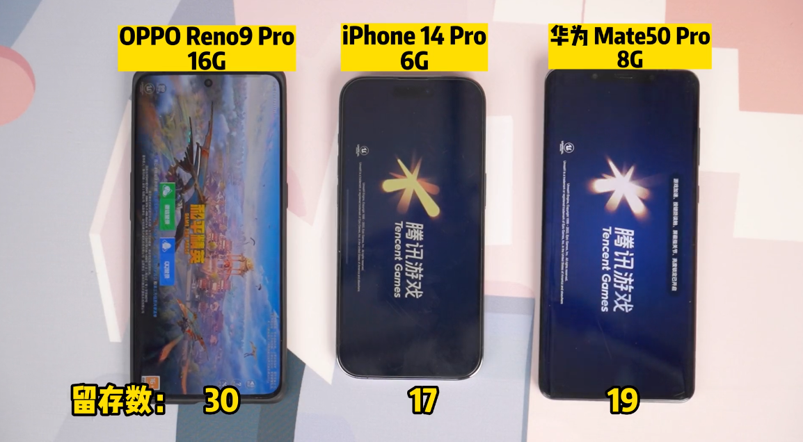 在同时开启30个APP的过程中,三款手机的页面滑动,还是非常流畅的。而在重新打开30个APP依次查看后台情况后,可以看到,iPhone 14 Pro的软件留存数只有17个,华为Mate50 Pro的表现稍好一些,留存数量达到了19个,其中大型游戏可以说是重灾区,两款手机在重新打开游戏后都需要加载;而OPPO Reno9 Pro+的表现可能最让人意外,留存数量为30个,也就是说所有应用都可以正常打开,并且没有出现杀后台的情况。