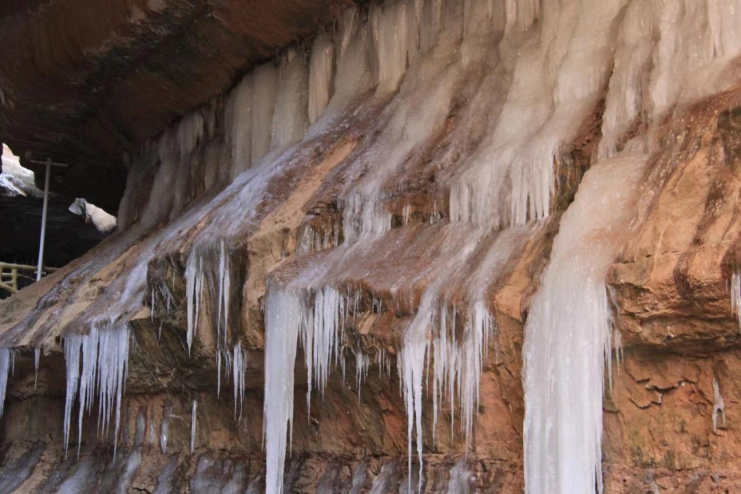秋看叶,冬看冰。冬季,龙栖谷内岩层渗出的地下水受寒结冰,形成庞大的冰瀑群,与丹霞浑然一体,如同一座地下冰宫、天然冰库,让人叹为观止,流连忘返。晶晶冰幔挂峭壁,奇景入目心旌摇。没有泉水叮咚,没有鸟叫蝉鸣,只听着寒风吹动冰棱的声音,这是一场属于庆阳的独特冰雪奇缘。