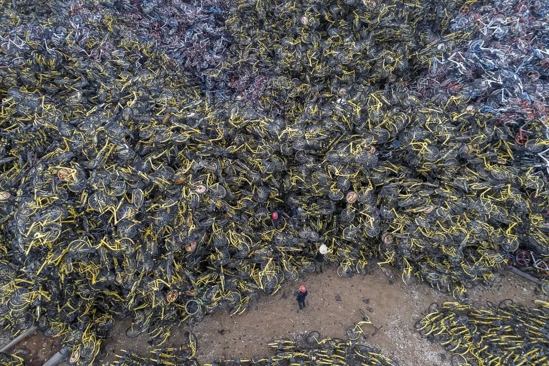 “厦门同安规模最大的一处共享单车坟场,这里几乎堆放了厦门本岛上所有的共享单车,据说有20万辆,宛如小山。”
