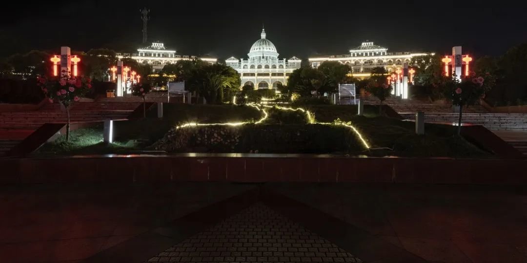 萍乡安源区政府大楼前最为热闹,晚上有很多人在广场上跳广场舞,华灯映照下穹顶熠熠生辉,给人身处白宫的既视感。