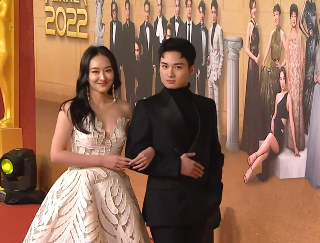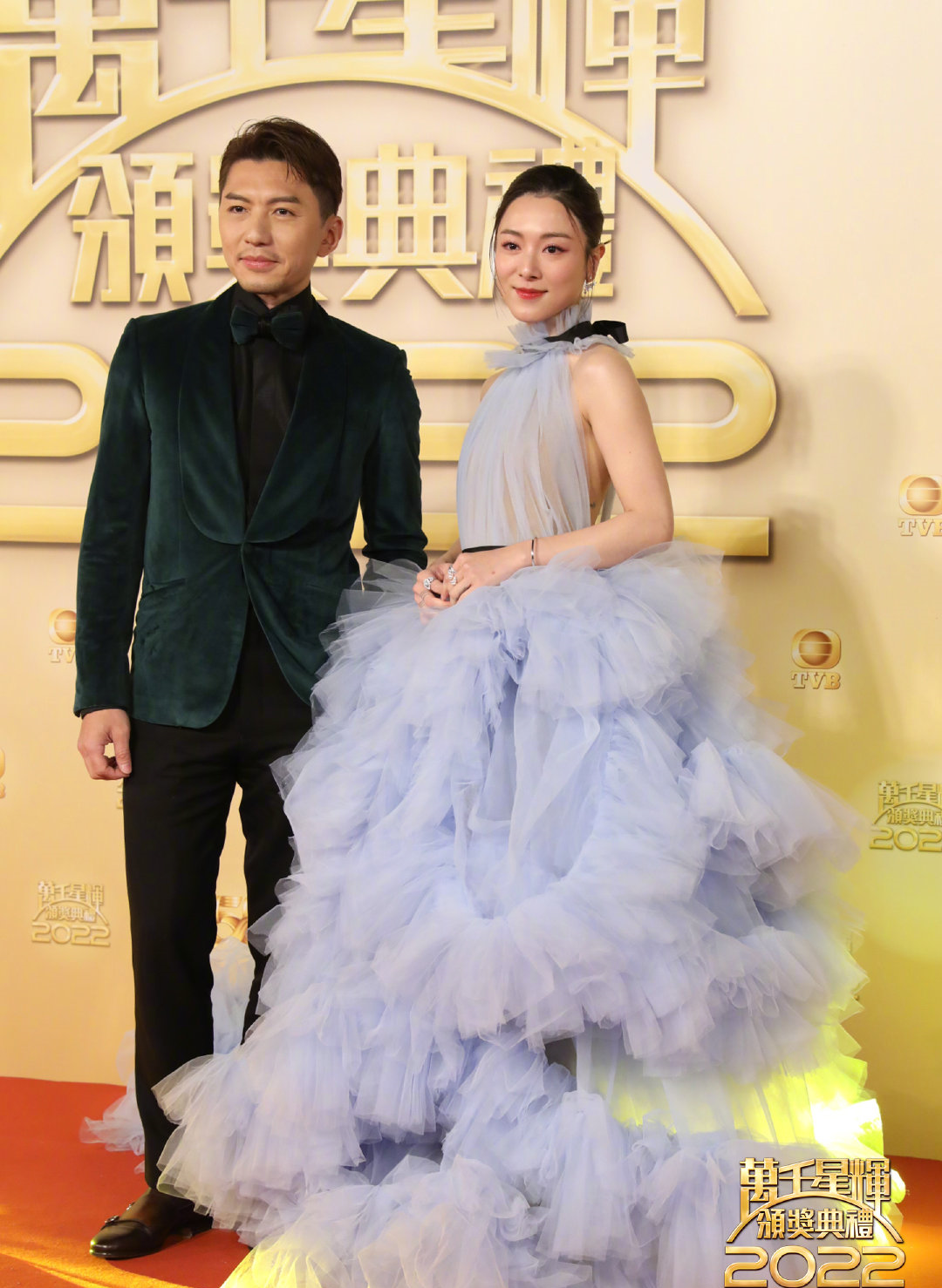 袁伟豪穿了一件墨绿色丝绒西装外套,很儒雅;王敏奕穿了一条淡紫色的纱裙,很梦幻。这一对算是红毯上无论穿搭还是妆发都比较好看的组合了。