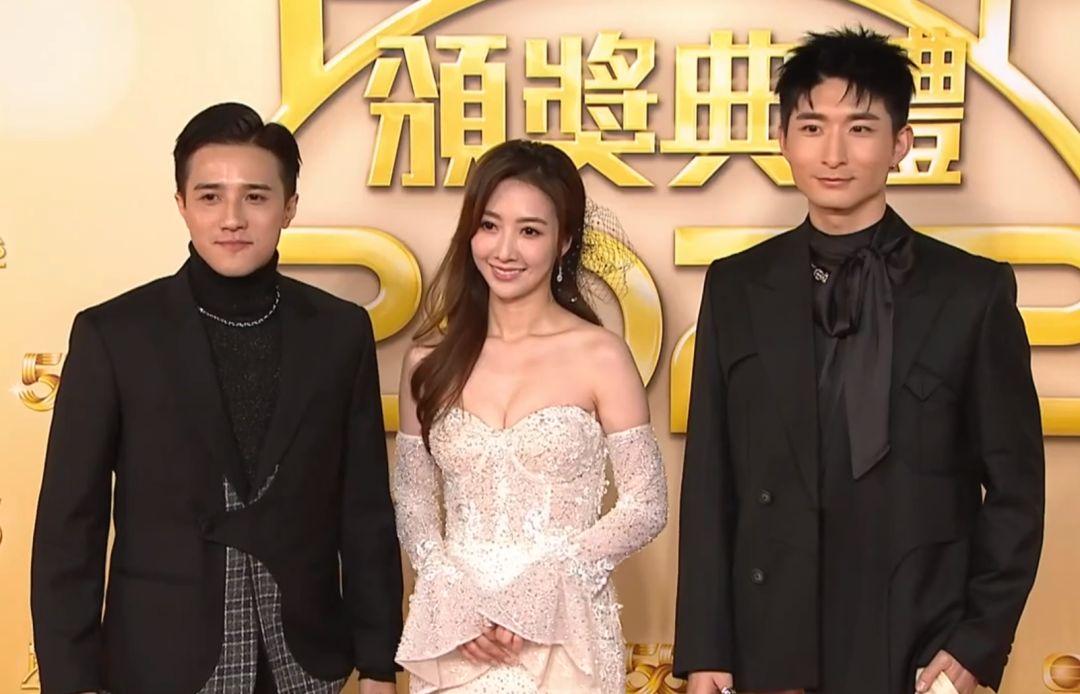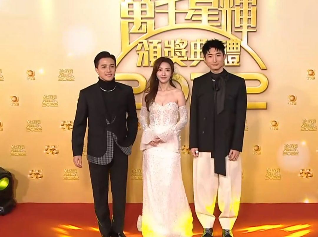 《东张西望》的三位女主持人一起亮相红毯,不过大家的衣着品位不太一样。陈庭欣(最右)的裙子最为大胆,深V的设计秀出了好身材。但最左边的吴幸美应该是三人中穿着最拉胯的,这条暗红裙子既俗气又有点土,不懂造型师是怎么想的。