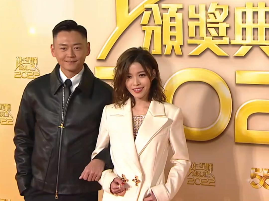 李施嬅(改名前叫李诗韵)穿了一条样式较为普通的橙色长裙,实在没办法夸好看。陈山聪穿了一套白色西服,还特意戴上了一朵玫瑰花胸针作点缀。