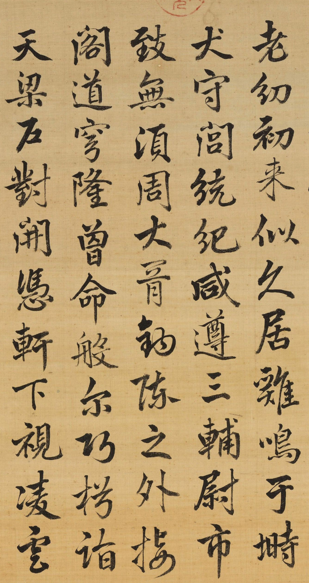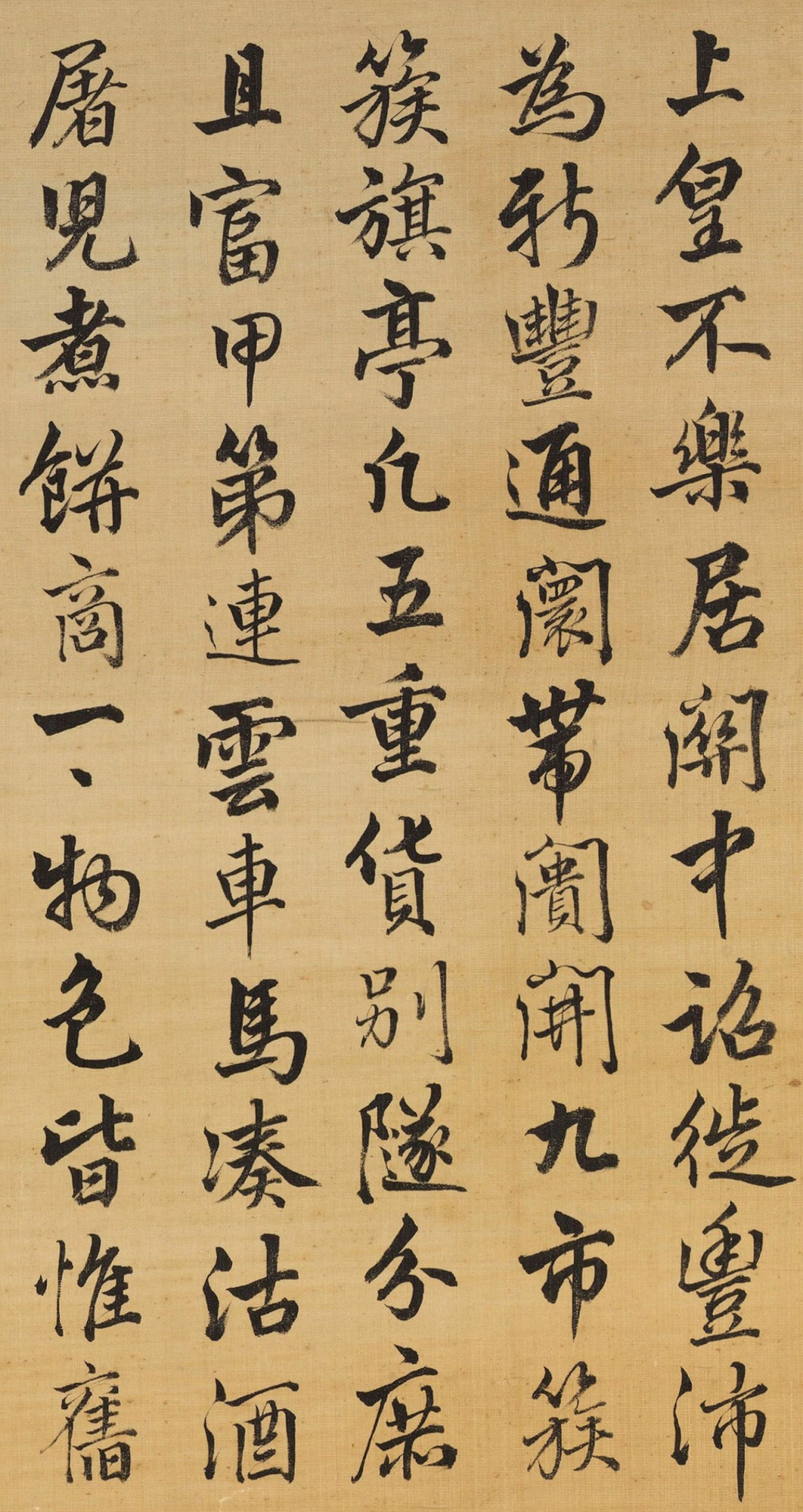 释文:上皇不乐居关中。诏徒丰沛为新丰。通阛带阓开九市。簇簇旗亭凡五重。货别隧分庶且富。甲第连云车马凑。沽酒屠儿煮饼商。一一物色皆惟旧。老幼初来似久居。鸡鸣于埘犬守闾。统纪咸遵三辅尉。市致无须周大骨。钠陈之外皆阁道。穹隆曾命般尔巧。枵诣天梁户对开。凭轩下视凌云鸟。古今都会称长安。谁欤营者匠胡宽。祇今荒土基难觅。还留图画人间看。乾隆甲子(1744年)春月御题。臣张若霭敬书。