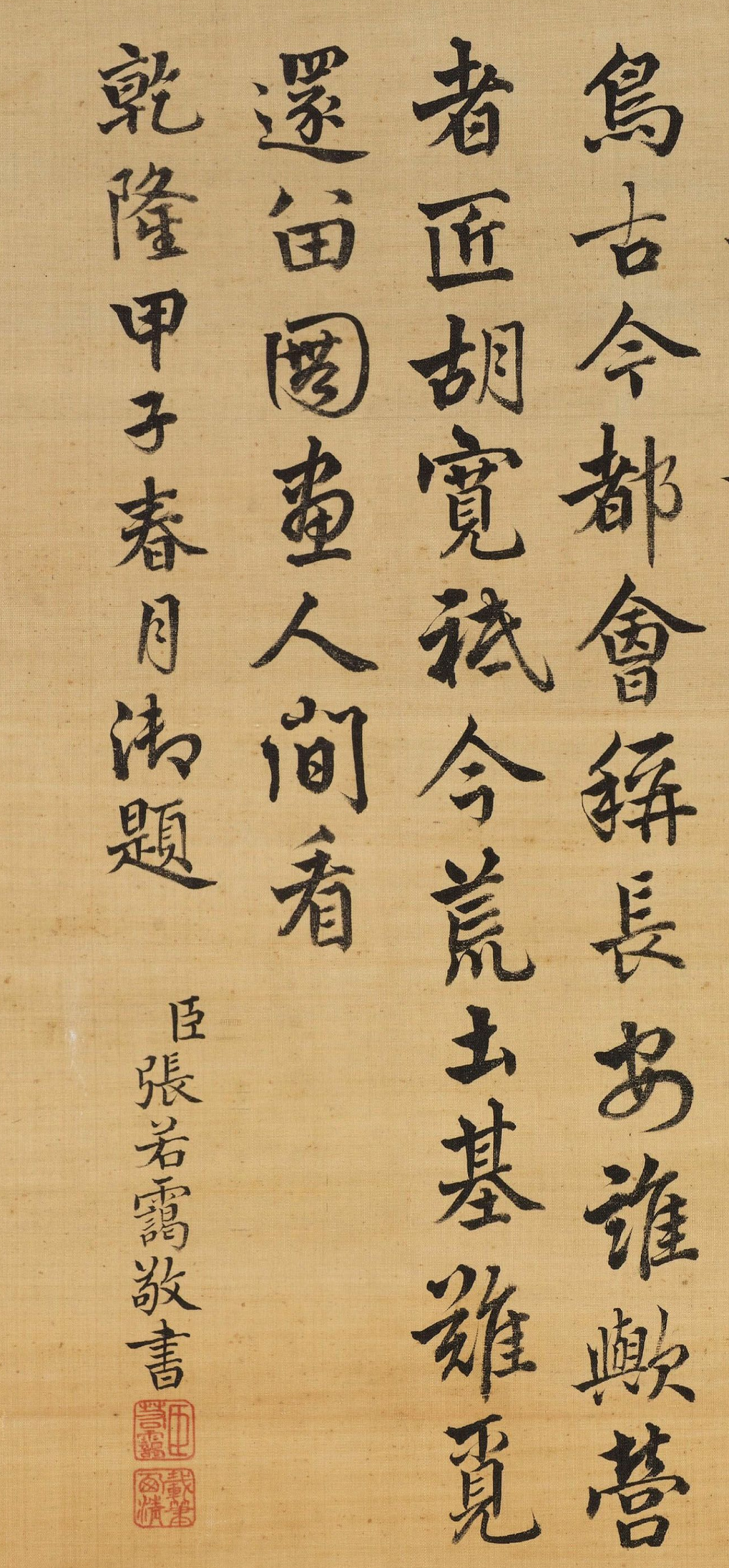 张若霭(1713-1746),安徽桐城人。雍正十一年(1733)进士,官至礼部尚书。以书、画供奉内廷。著《晴岚诗存》。张若霭书御题新丰图,台北故宫博物院藏。