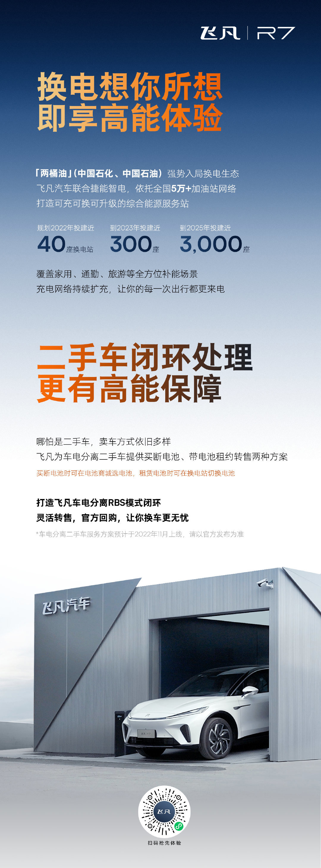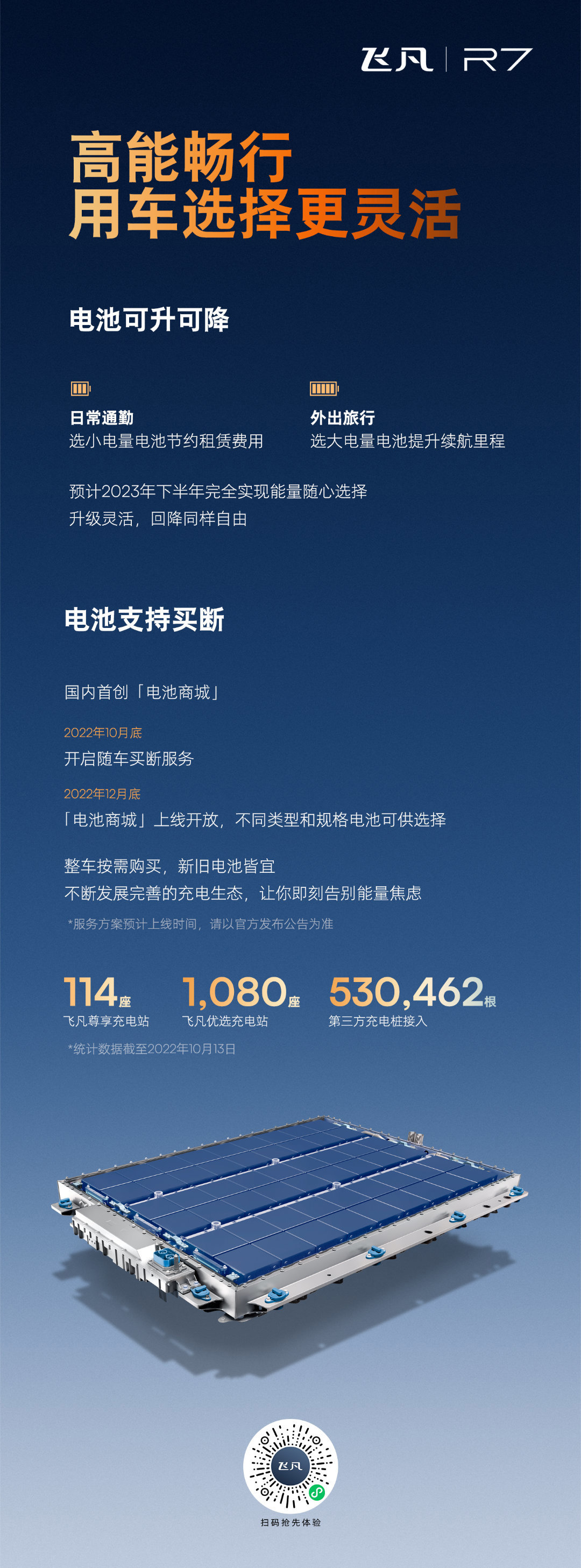 购车时如选择 2 年每年 1500 度的充换电权益,后续换电将自动抵扣电量差值。当用户想停止电池租赁模式,可在电池商城选择新 / 旧电池买断服务。飞凡官方二手车平台支持车辆电池带租出售,如用户想在其他平台出售二手车,届时也可选择电池买断。