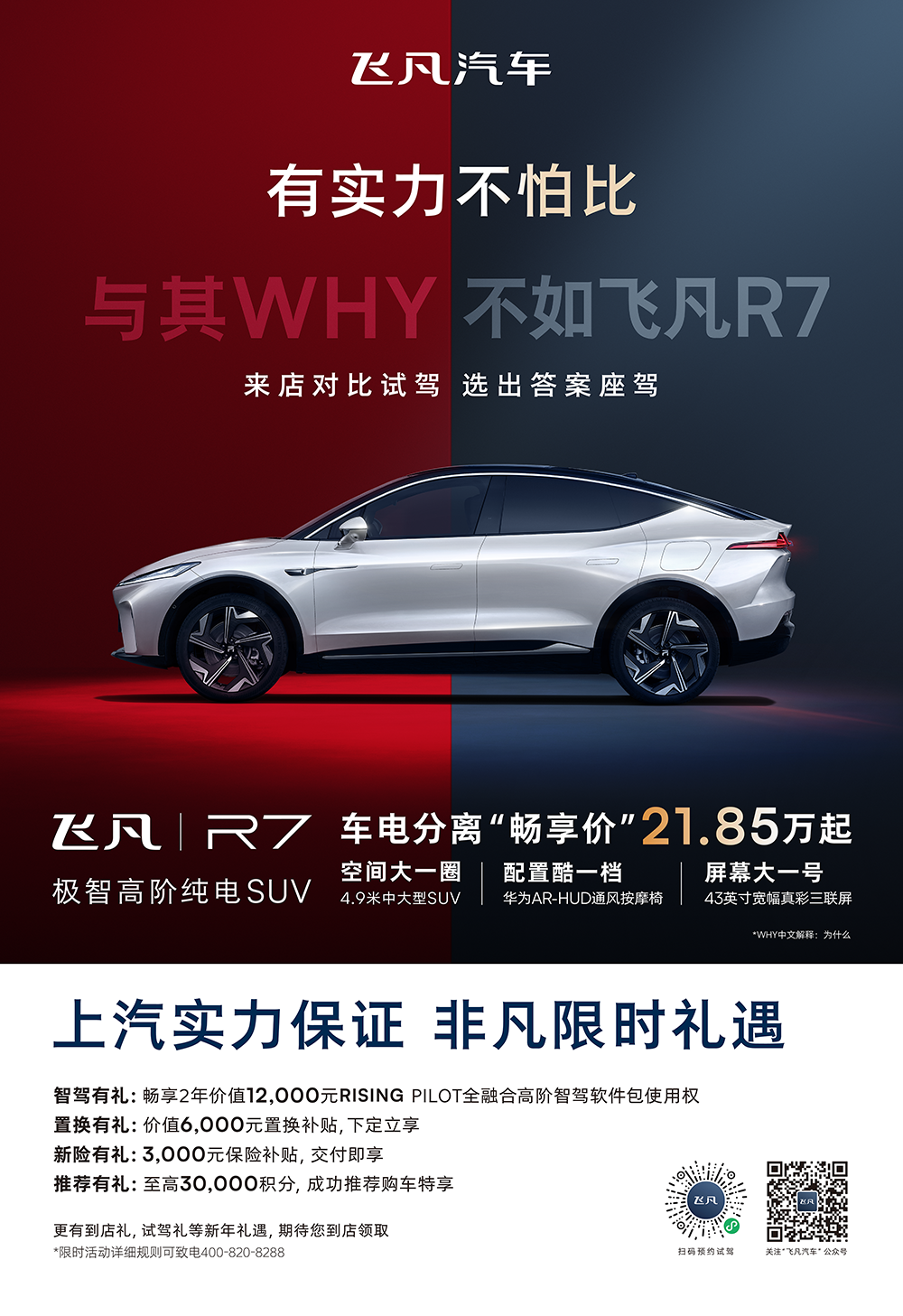 飞凡汽车现宣布,2 月 28 日之前购买飞凡 R7 可以享受价值 2.1 万元的限时购车礼遇,车电分离价为 21.85 万元起。