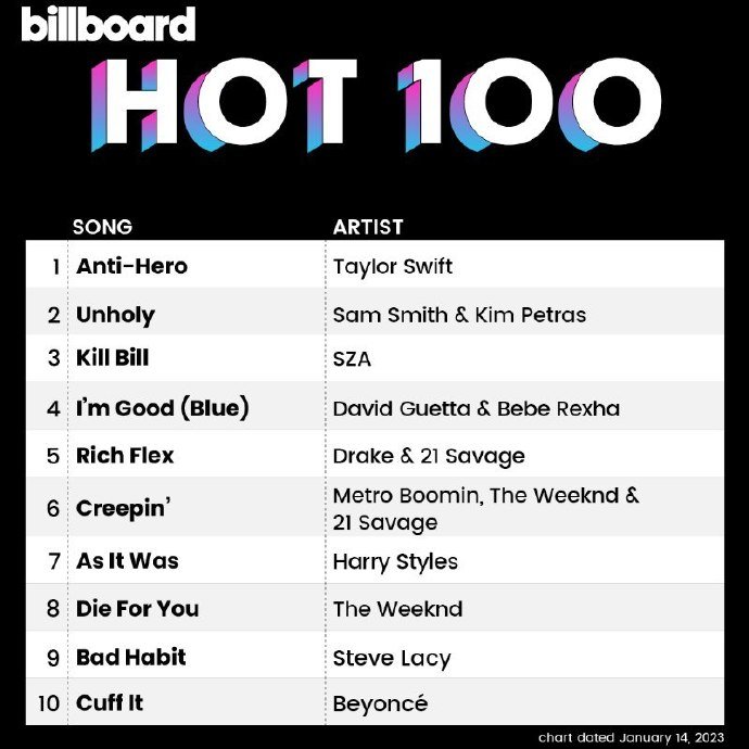 新一期Billboard单曲榜公开,Taylor Swift热单《Anti-Hero》重回榜首,《Unholy》与《Kill Bill》分列二三位,《I’m Good (Blue)》升至第四刷新最高排名,Beyoncé单曲《Cuff It》本周升至第十。