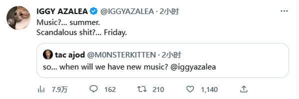 Iggy Azalea在回答粉丝提问时表示个人新音乐将在夏季发行。并暗示本周五也将会有动作(合作单?)
