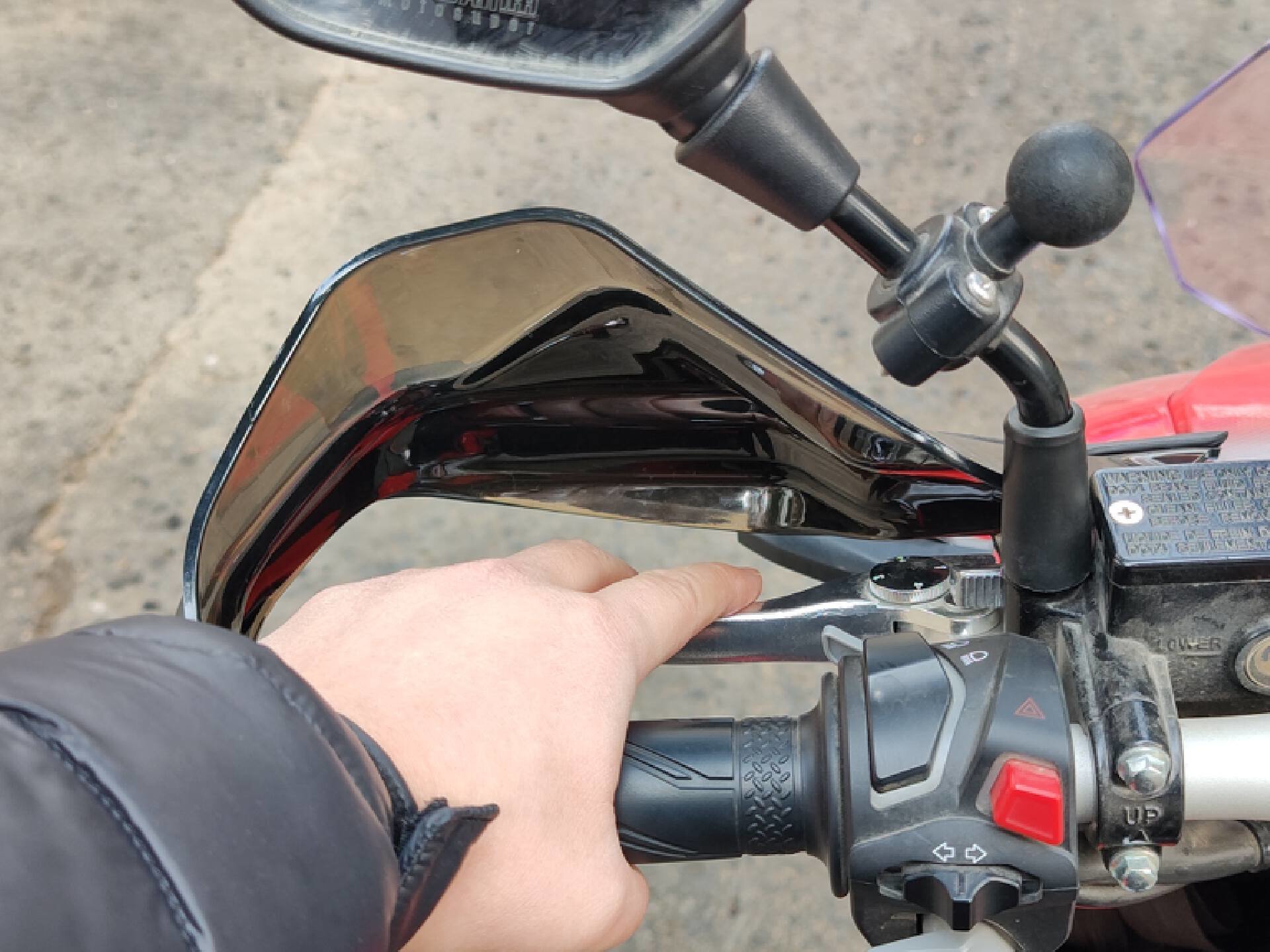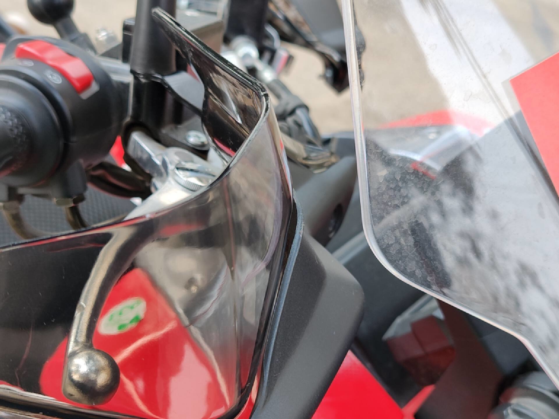也许有朋友会问,安装护手后方向打死会不会剐蹭前风挡?经过测试可以发现车把转到底后,和风挡之间有3cm的余量空间,在设计上还是比较靠谱的。
