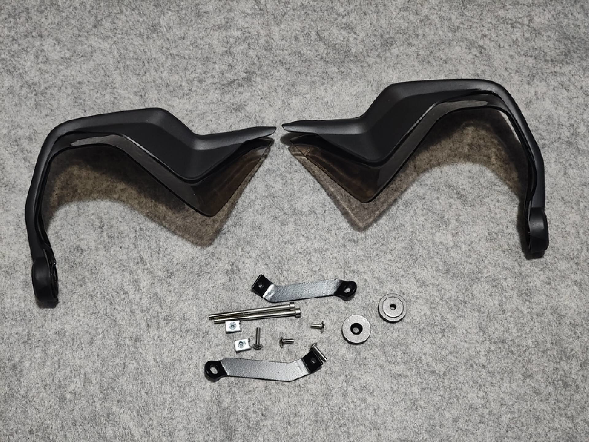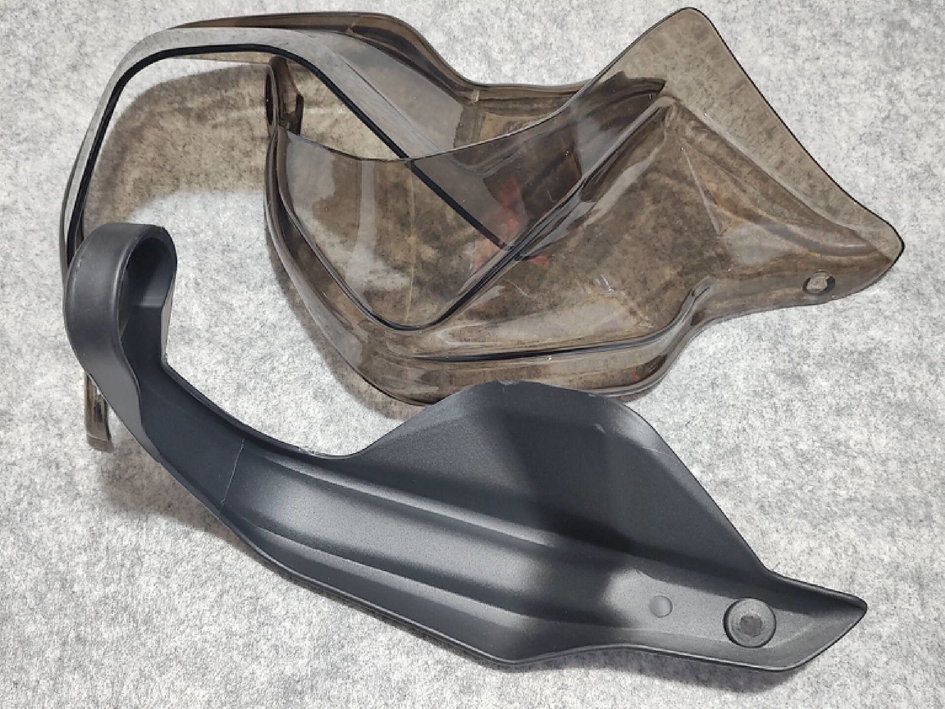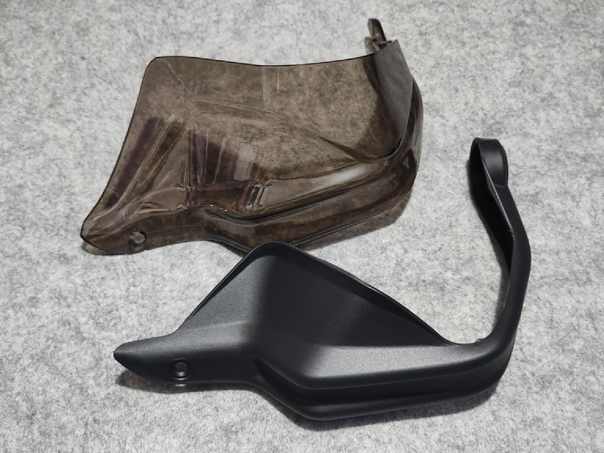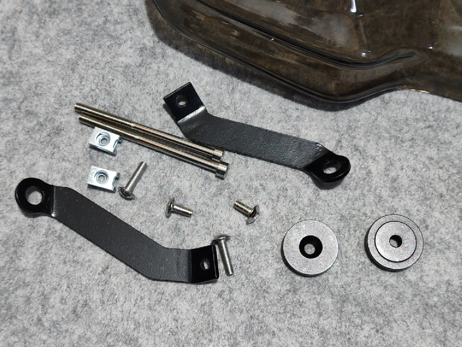 我买的是极宙护手+茶色加高片款,其实也可以单独购买护手,但一个护手有点单薄,两个加起来保护性更好一些,价格也没贵多少。就是不知道什么原因店家发货比较慢,等了一个多礼拜才发货。下图是全部组件特写,包括护手+加高片,一套安装螺丝,没有附赠安装工具。